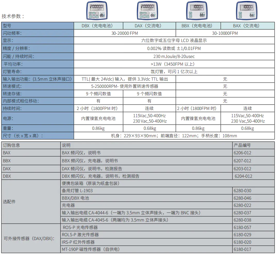 美國monarch蒙納多公司研發產品,原型號DB230頻閃儀已經停產,替代型號是Nova-Strobe(氙燈系列) DBX頻閃儀。Monarch Nova-Strobe DBX頻閃儀是以一定頻率閃動的光源。在用頻閃儀觀測高速旋轉或運動的物體時,通過調節它的閃動頻率,使其與被測物的轉動或運動速度接近并同步時,被測物雖然在高速運動著,但看上去卻是緩慢運動或相對靜止的。這種視覺暫留現象,使人目測就能輕易觀測高速運動物體的運行狀況。如各類轉子、齒輪嚙合、振動設備診斷、紡織、印刷、包裝生產線、高速物體表面缺損及運行軌跡。monarch蒙那多頻閃儀dbx被廣泛應用于機械制造、印刷、輕工、紡織、電力、醫藥、食品加工等行業。 DAX和DBX量程為30-20000FPM,精度±0.002%,可通過×2和÷2按鈕快速調節閃動頻率,然后通過旋鈕進行微調。提供了TL信號輸入輸出接口,可外接轉速傳感器,可由外部傳感采集數據并觸發頻閃儀工作,也可輸出信號觸發其他頻閃儀工作,可多臺DBX/DAX連接,由一臺觸發所有DBX/DAX同時工作。DBX和DAX具有相位延遲功能、可調節圖像至方便觀泌的角度,可存儲9個頻閃數值。頻閃燈泡主要適用于美國蒙那多頻閃儀。L-190頻閃儀燈泡,可配dax、dbx、bax、bbx等monarch系列頻閃觀測儀。 monarch蒙那多頻閃儀dbx產品特點: 內置充電電池(BBX、DBX)或交流電供電(BAX、DAX) 便攜是頻閃儀 持續低溫運行 帶三腳架安裝接口 monarch蒙那多頻閃儀dbx技術參數