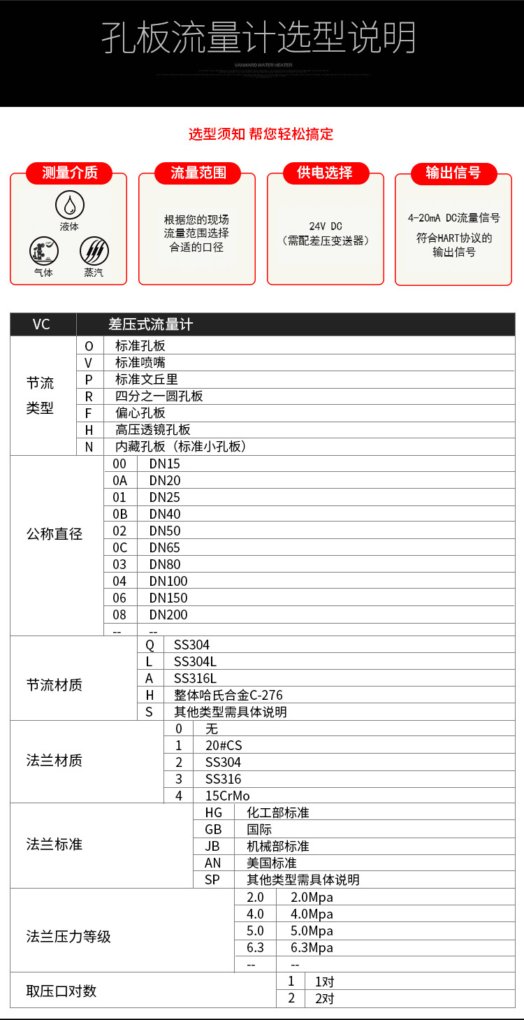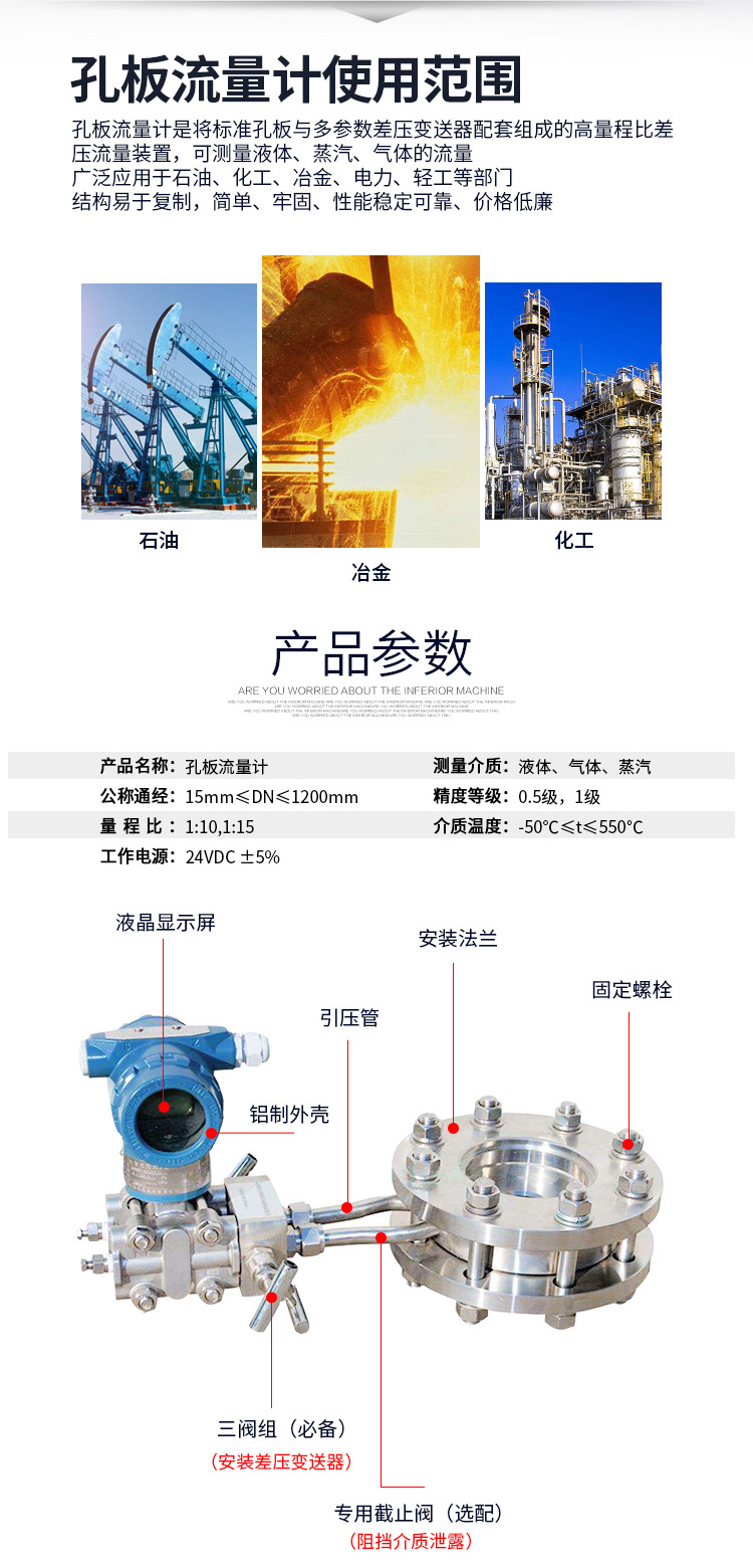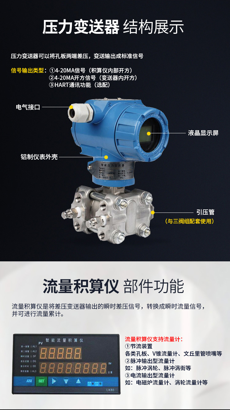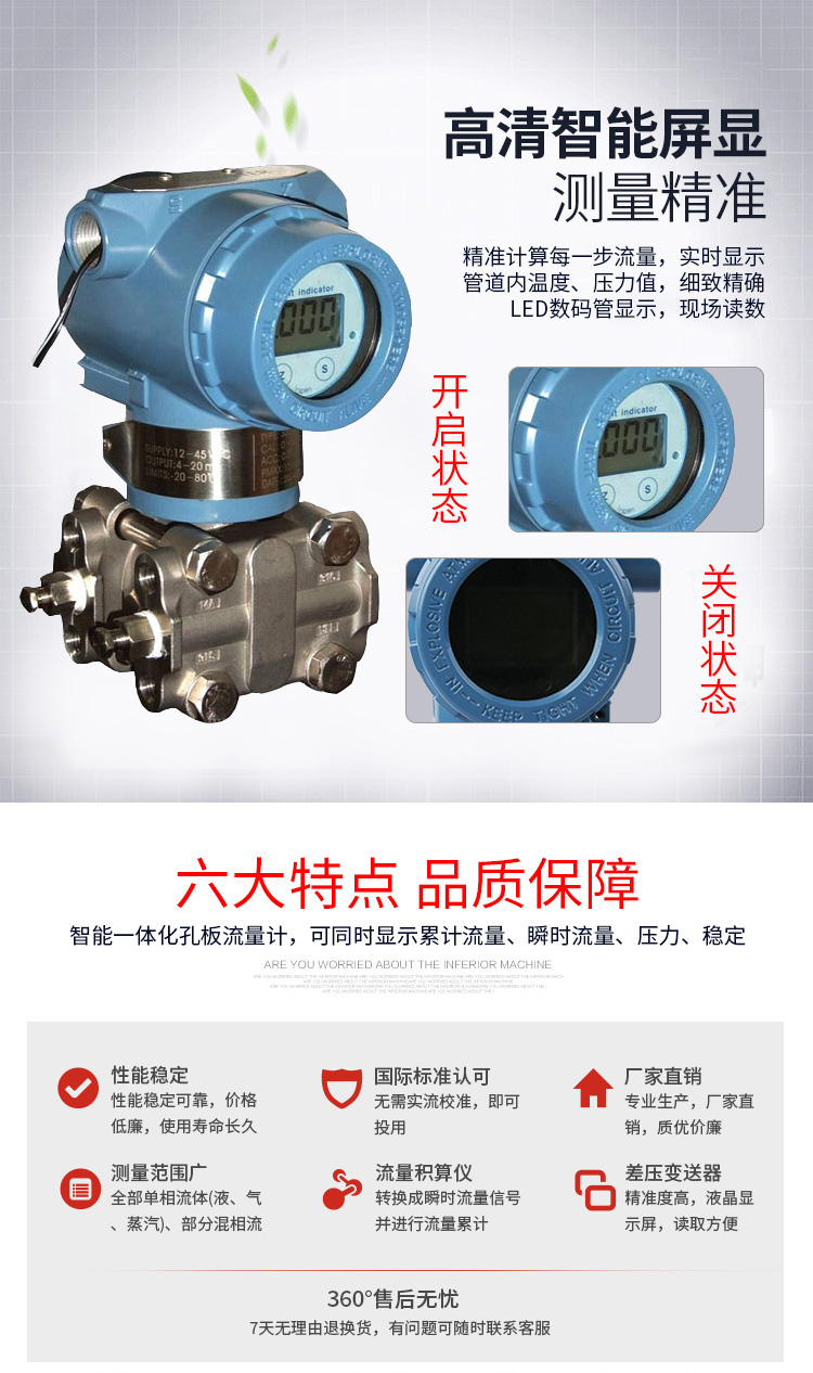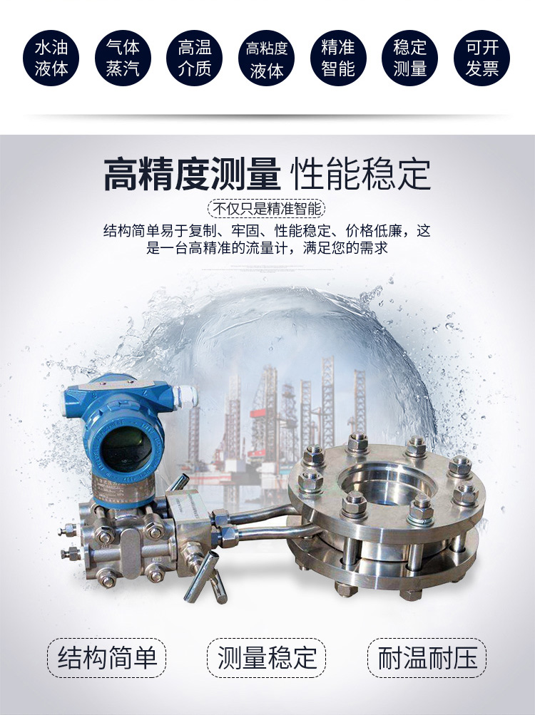 LG一體式孔板流量計特點 采用進口單晶硅智能差壓傳感器 高精度,完善的自診斷功能 智能孔板流量計智能孔板流量計其量程可自編程調整。 智能孔板流量計可同時顯示累計流量、瞬時流量、壓力、溫度。 具有在線、動態全補償功能外,智能孔板流量計還具有自診斷、自行設定量程。 配有多種通訊接口 穩定性高 量程范圍寬、大于10:1 LG一體式孔板流量計技術參數