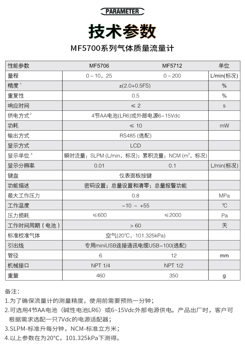 MF5706微型氣體質(zhì)量流量計技術(shù)參數(shù):