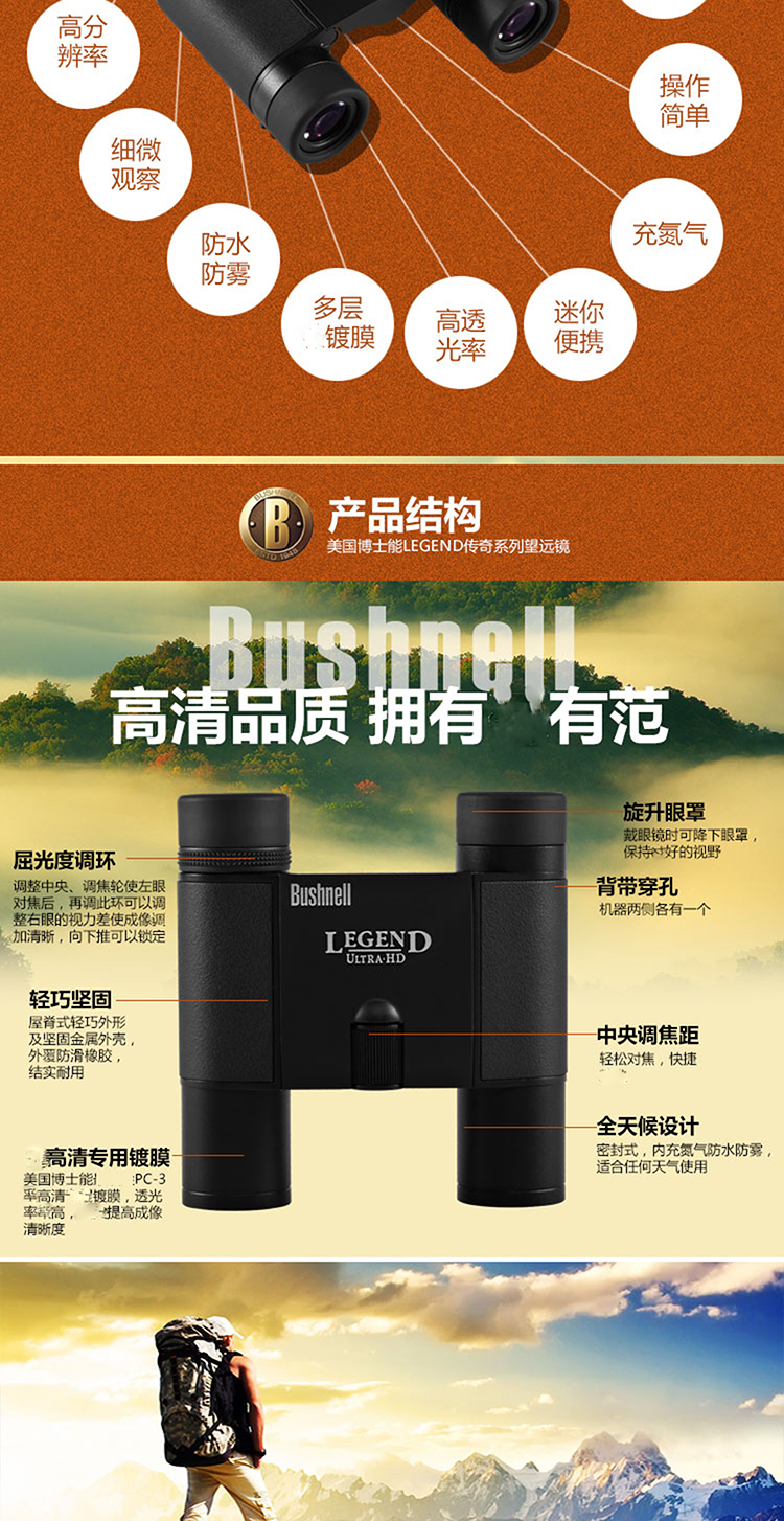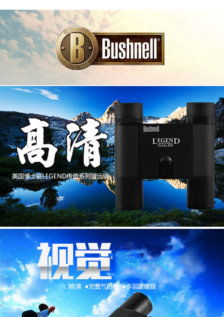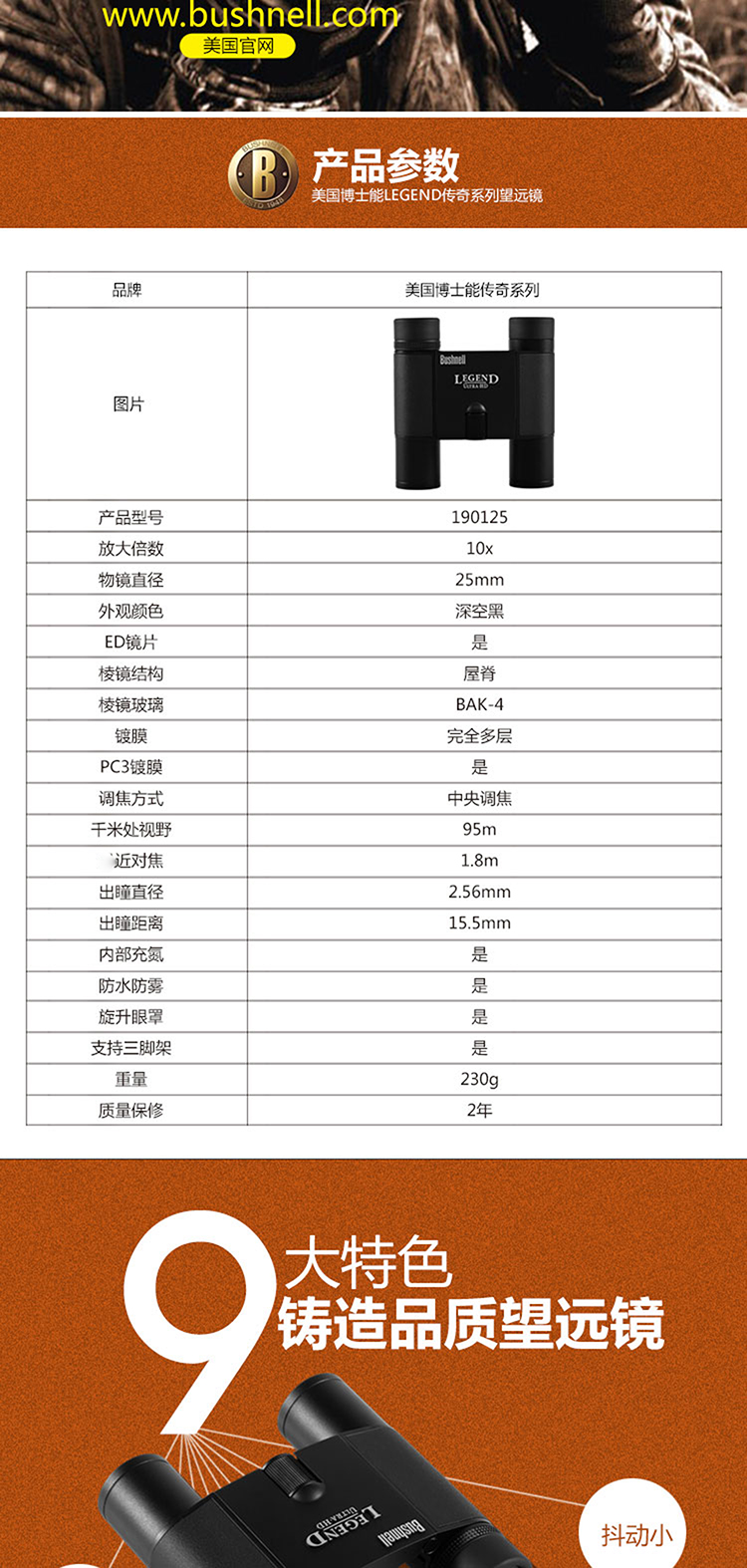 美國bushnell博士能雙筒望遠鏡傳奇LEGEND 190125 10x25 充氮防水ED鏡片
