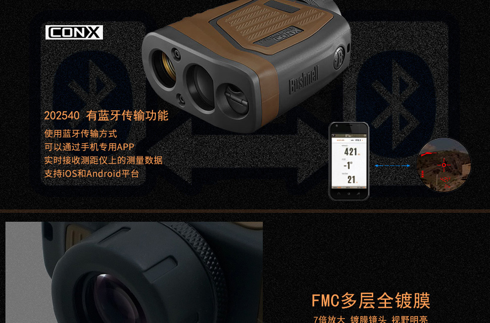7倍的放大倍率,26毫米物鏡口徑,可測量5 – 1760碼。基于CONX技術,可通過藍牙連接蘋果iOS或Android設備。并使用智能手機加載三個自定義彈道曲線,基于風速精確計算彈道。 VDT(生動的顯示技術) 第二代E.S.P. (至尊高速精密) – 提供多達1/2碼的精度和1/10碼顯示精度 VSI(可變視線-IN) 范圍:5-1760碼 屈光度調節 兼容磁性附著體系統 完全防水 內置三腳架安裝孔