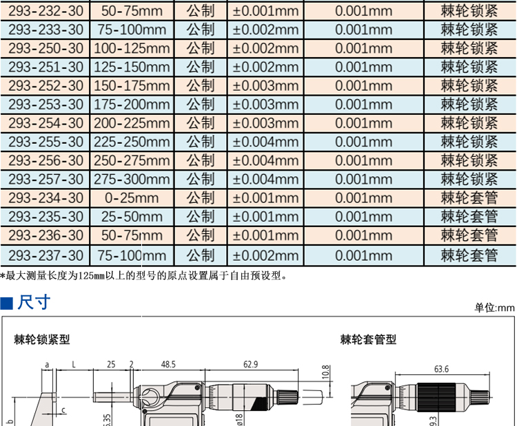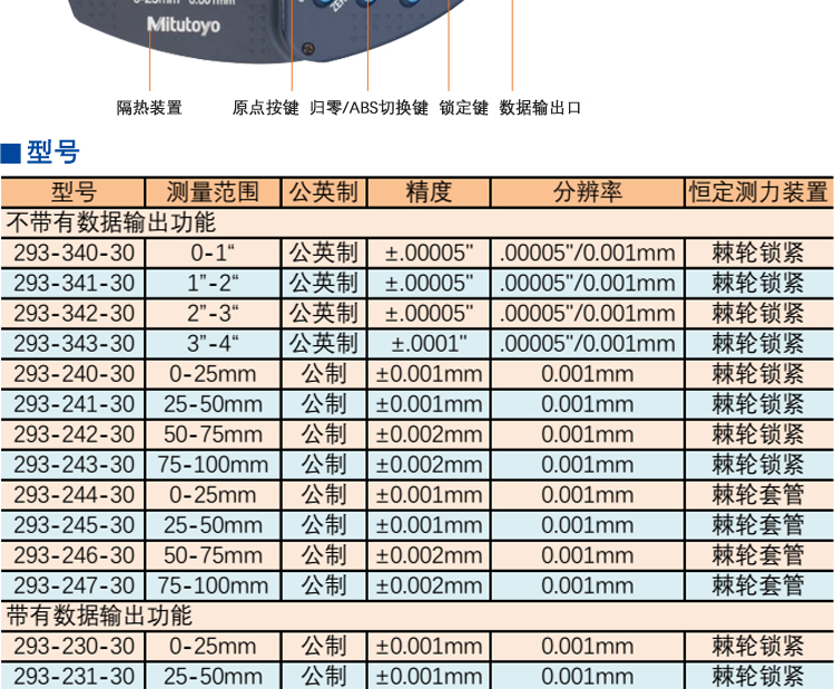 | 293-234-30 | 0~25mm | ±1μm | 1μm | 棘輪套管 | 280g |