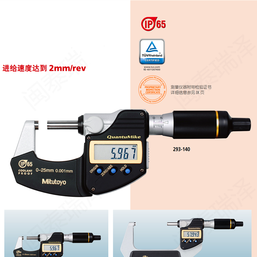 三豐293-154-30快進型千分尺,1mm心軸螺紋間距易于快速設置,套管上刻有100條刻度,可直接對測量值進行讀數,測量面帶有硬質合金頭