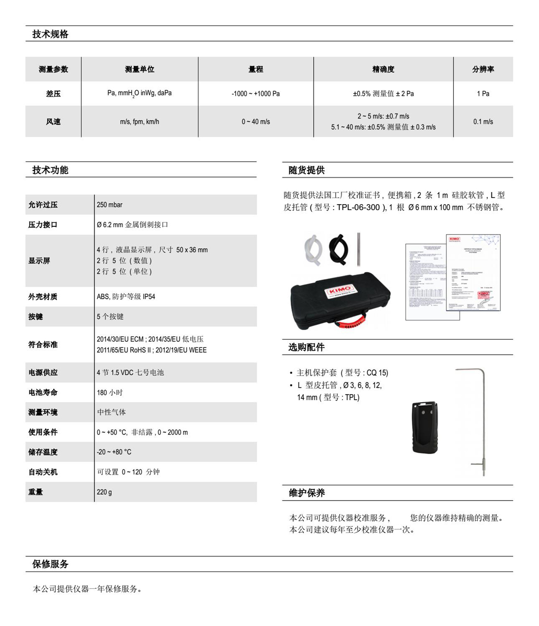 法國kimo儀器便攜式差壓計MP120隨貨提供:法國工廠校準證書,, 便攜箱 , 2 條 1 m 硅膠軟管和1 根 ? 6 mm x 100 mm 不銹鋼管。