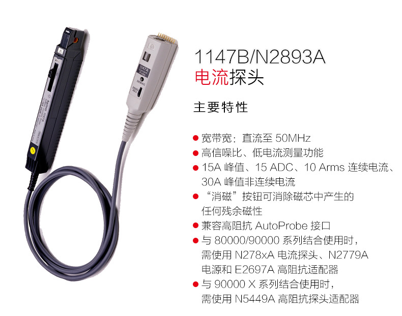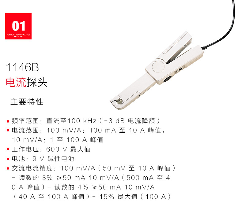 這款交流/直流電流探頭提供 100 mA 至 100 Arms 直流至 100 kHz 電流的精確顯示和測量,并且無須斷開電路。Keysight 1146B 使用霍爾效應(yīng)傳感器技術(shù)來測量交流和直流信號(hào)。它兼容任何具有 0.2 至 0.5 V/格靈敏度和 1 MΩ BNC 輸入的是德示波器。與具有 50 歐姆輸入的高端 Infiniium 示波器配合使用時(shí),需要使用高阻抗適配器(用于 80000 和 90000 系列的 E2697A,或用于 90000X/Q 系列的 N5449A)。
