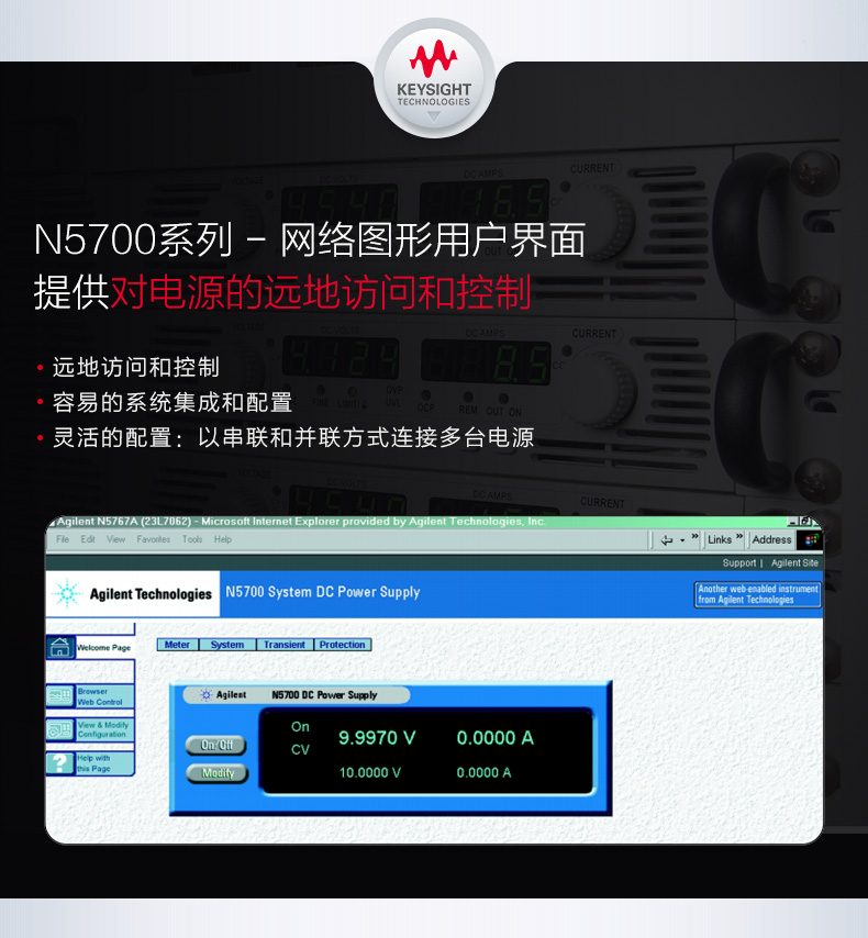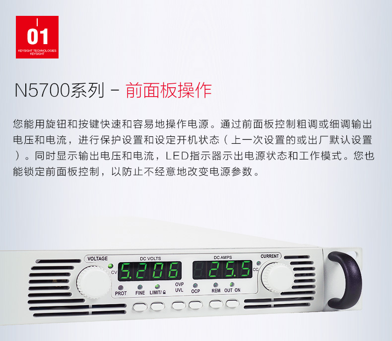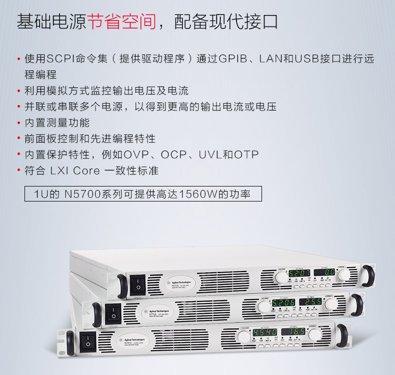 快速將 N5700 系列整合到需要 750W 至 1500W 直流電源的任意系統中。它采用真正的 1U 高設計,使儀器可以直接安裝在這個電源的上方或下方。通用交流輸入,無需使用開關和更換熔絲。借助現代化 I/O 接口或模擬編程,可以方便地實現自動化功能。快速掃一眼在明亮的前面板上顯示的工作狀態,便能確認工作是否正常。