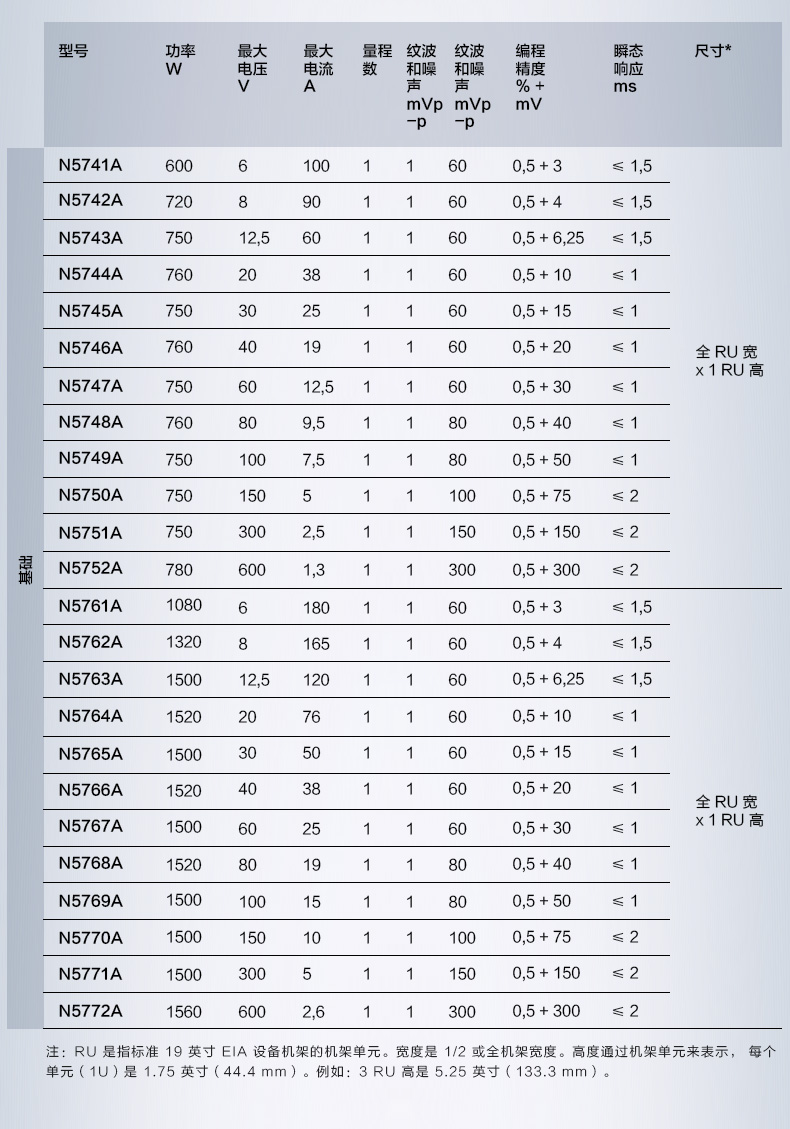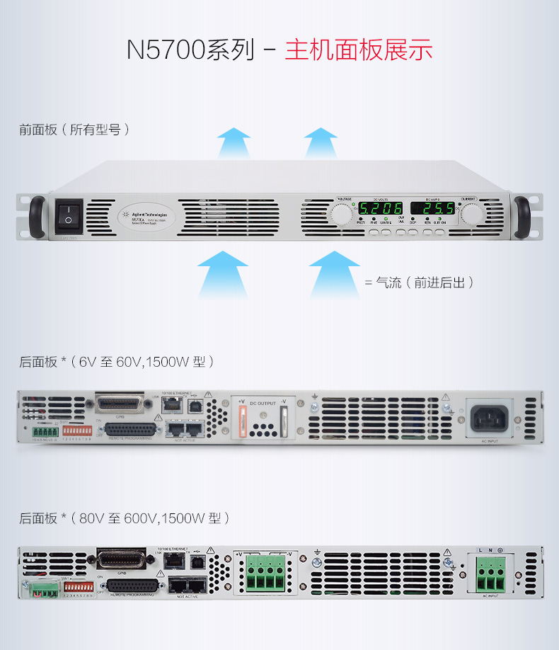 Keysight N5700 系列的噪聲功率很低,而且外形緊湊,僅有 1U 高。氣流可以在電源內部從前往后流動,因此在自動測試設備(ATE)機架的電源上方或下方不需要留出額外空間。您可以選擇 6 V 至 600 V的輸出電壓。對于小電流應用,750 W 型號可提供 1.3 A 至100 A 的電流;對于需要更大電流的應用,1500 W 型號可提供兩倍的電流。