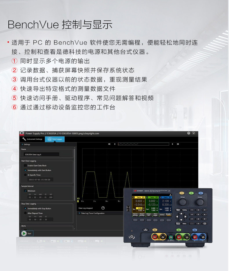 連接包括一個(gè)后板 USB 端口和 LAN / LXI 端口(** E36311A USB)。 所有裝置均可使用熟悉的 SCPI 指令或通過可互換虛擬儀器 (IVI) 驅(qū)動(dòng)器進(jìn)行編程。如果您使用新型 E36300 系列更換一個(gè) E3631A 電源,需要軟件兼容性,E36300 讓您可以更改其編程能力以匹配 E3631A,消除任何軟件更改。最后,您可以通過 Keysight BenchVue 軟件控制 E36300 電源。