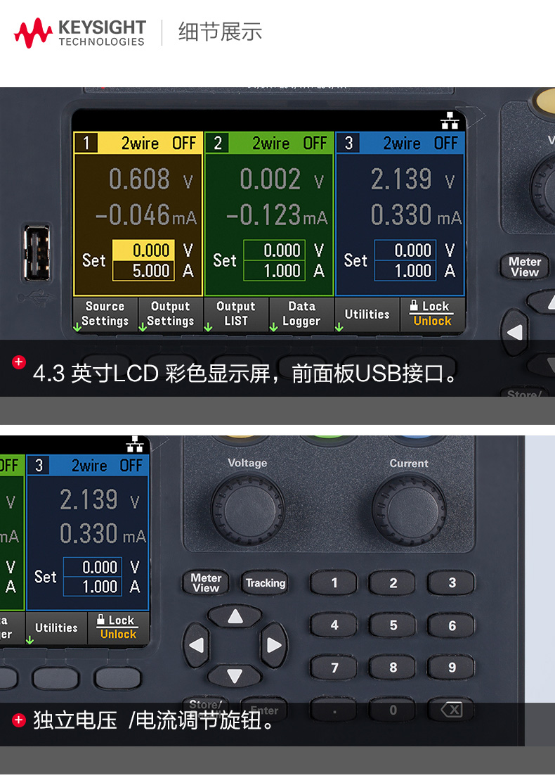 大型 4.3 英寸 LCD 彩色顯示屏 可同時(shí)查看所有三個(gè)輸出的全電壓和全電流