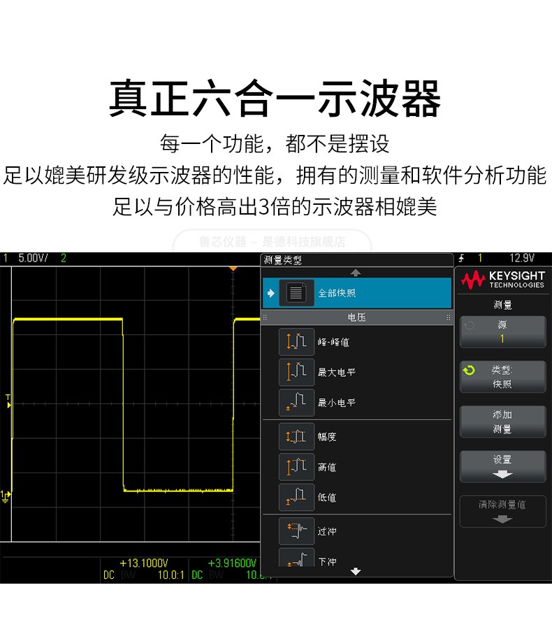 Agilent InfiniiVision 2000 和 3000 X 系列一臺儀器提供以下 4 臺儀器的能力:示波器;邏輯分析儀;函數(shù)發(fā)生器;協(xié)議分析儀。 型號可以完全升級(帶寬、MSO、WaveGen、存儲器、測量應(yīng)用),以滿足未來需求并保護投資。