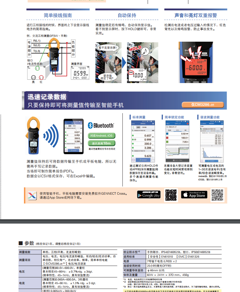 ●通過保持數據即可將測量值傳輸至智能手機中,并快速記錄數據(**CM3286-01)