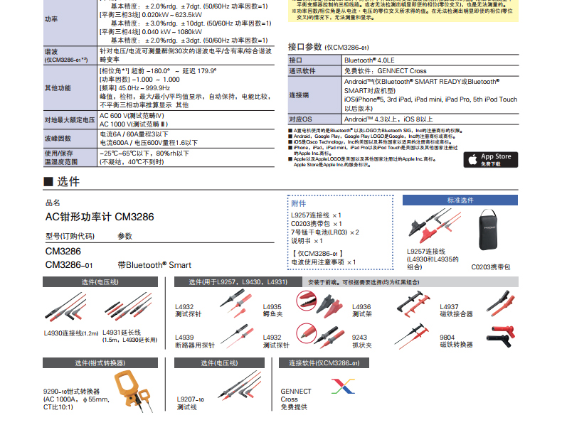 | 測量項目 | 電壓、電流、電壓/電流波形峰值、有功/視在/無功功率,功率因數,相位角※1無功效率,頻率,簡單單相電能 【**CM3286-01※2)】電壓/電流諧波 |