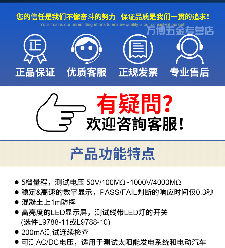 | 其他功能 | 帶電回路警報,自動放電,自動DC/AC檢查,比較器,防摔,自動省電 |