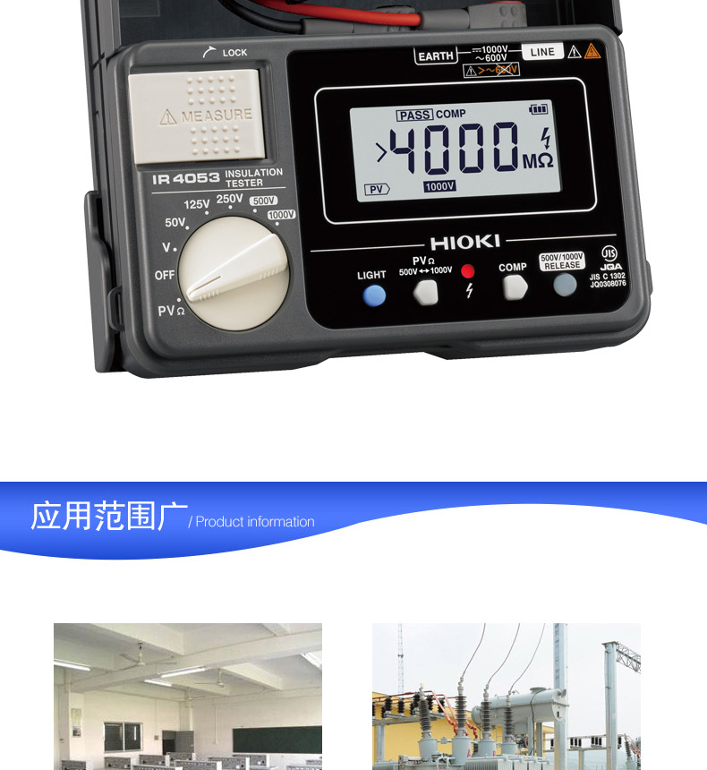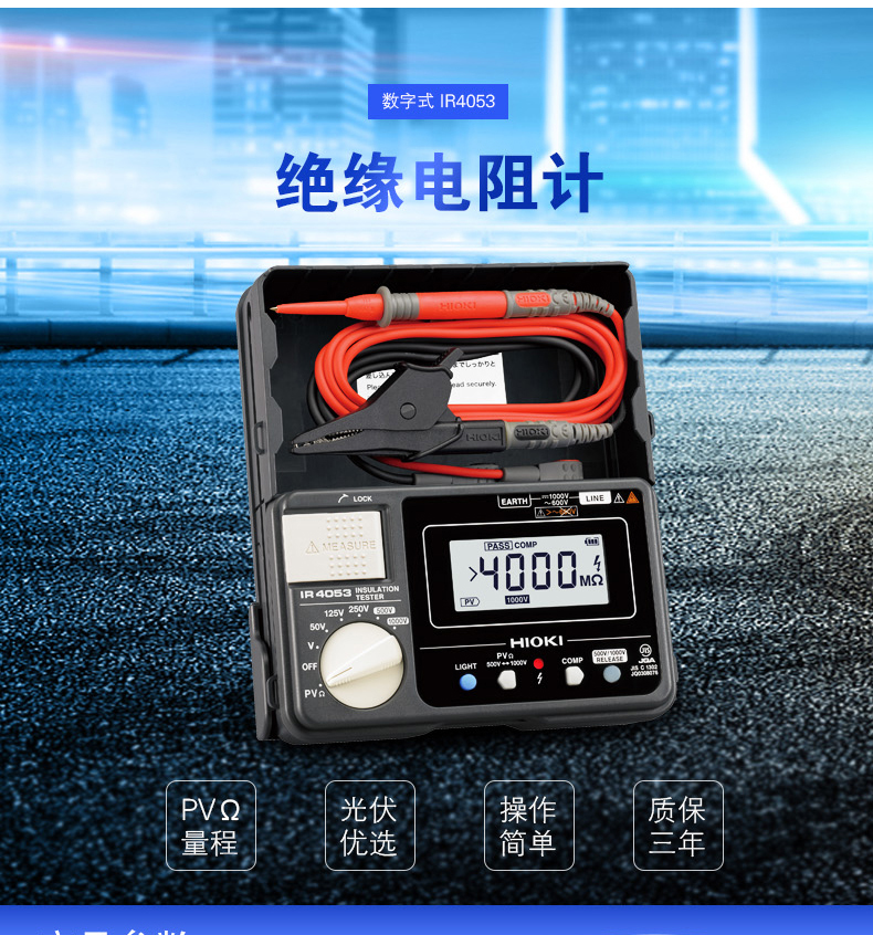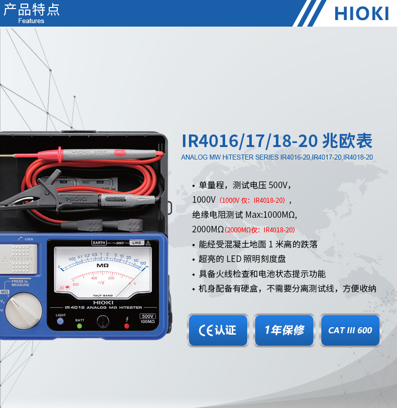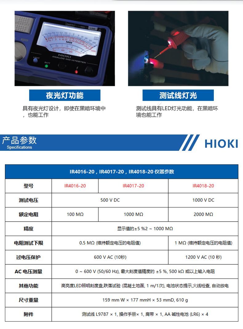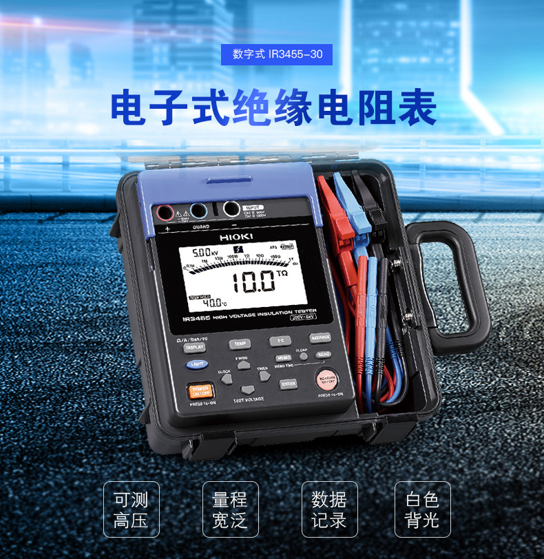| 電源 | 5號(LR6)堿性電池 ×4,連續使用:20小時(在HIOKI規定的條件下),測量次數:1000次(5sON,25sOFF循環,*低測量電阻值到保持額定測量電壓的絕緣測量) |