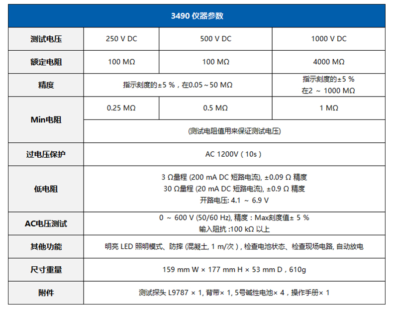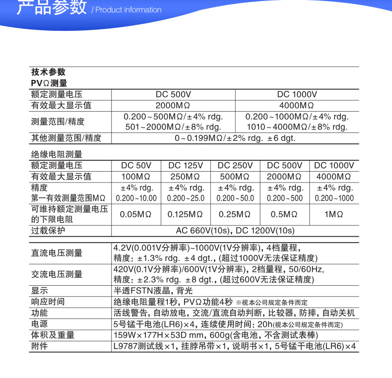 | 體積及重量 | 159 mm W ×177 mm H×53 mmD, 600 g(含電池和測試線) |