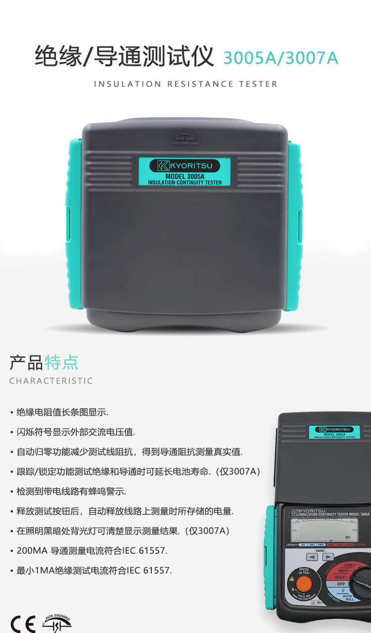 ?絕緣電阻值長條圖顯示.? 閃爍符號顯示外部交流電壓值.? 自動歸零功能減少測試線阻抗,得到導通阻抗測量真實值.? 檢測到帶電線路有蜂鳴警示.? 釋放測試按鈕后,自動釋放線路上測量時所存儲的電量.? 200mA 導通測量電流符合 IEC 61557.? 最小1mA絕緣測試電流符合IEC 61557.