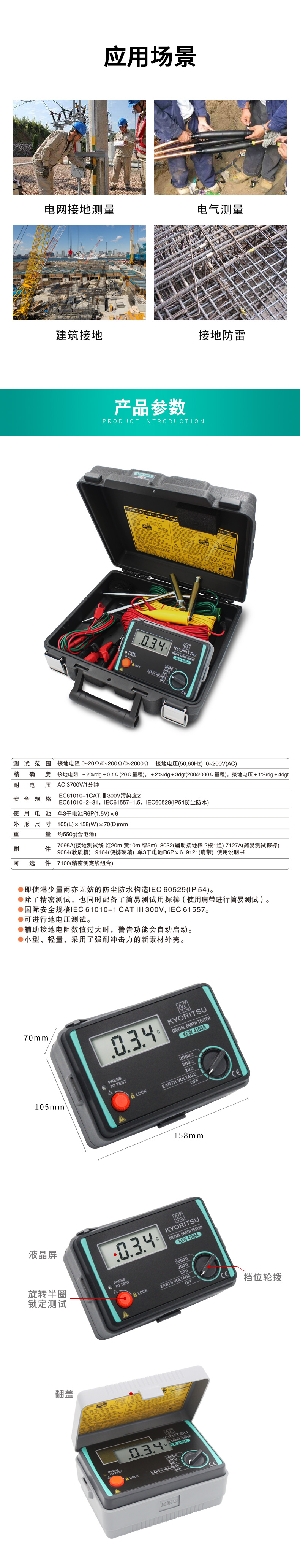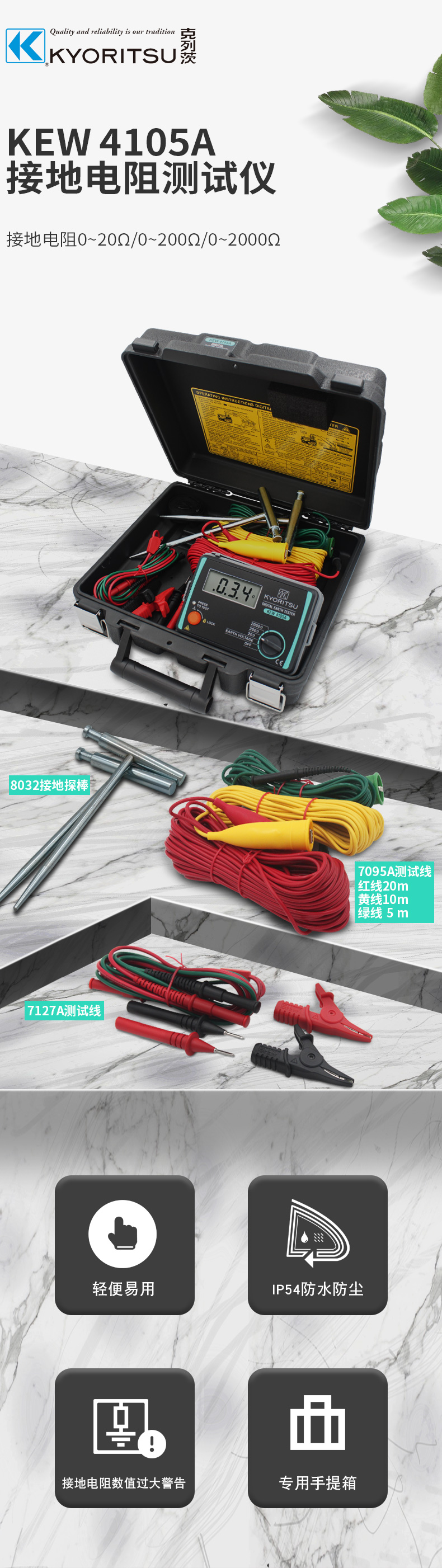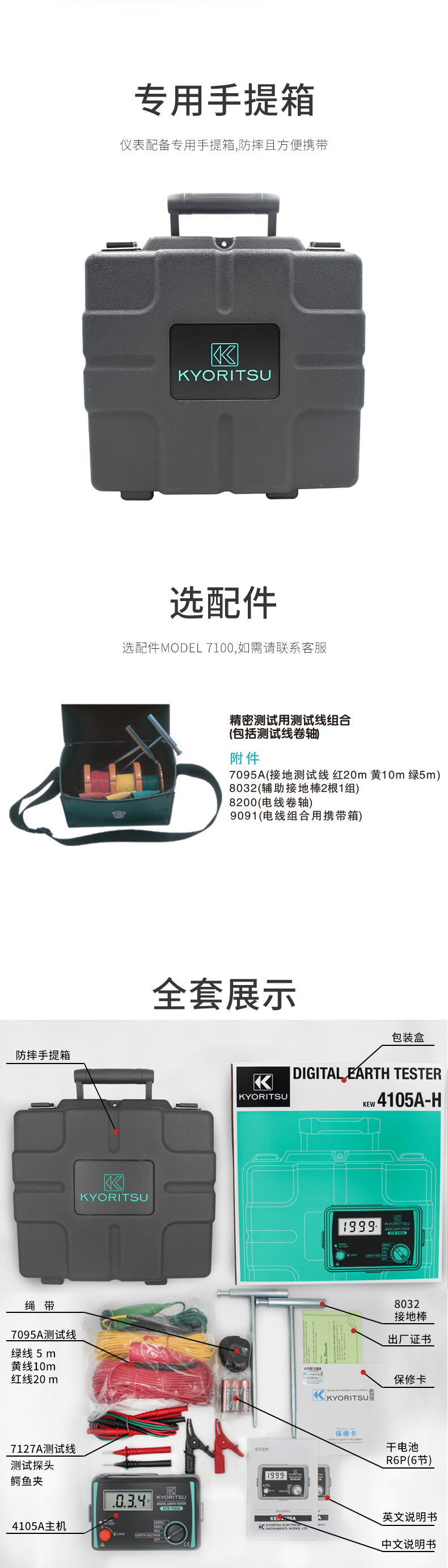 | 附件 | 7095A (接地測試線) (紅-20m, 黃-10m, 綠-5m) 8032 (輔助接地棒) × 2 7127A (簡易測試探棒) R6 (AA) × 6 9121 (肩帶) 使用說明書 9165(便攜箱[硬]) |