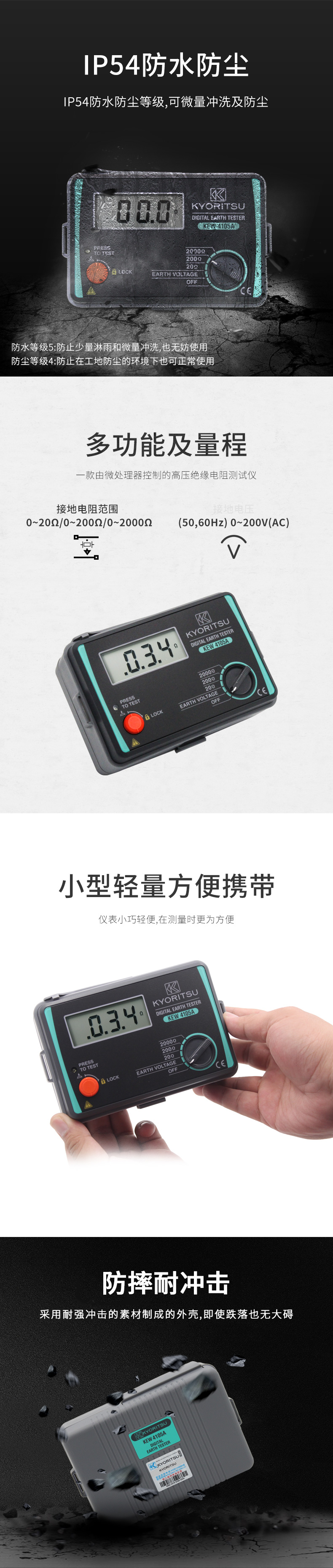 | 測量范圍 | 接地電阻: 0 - 20Ω/0 - 200Ω/0 - 2000Ω 接地電壓 [50,60Hz]: 0 - 200V AC |