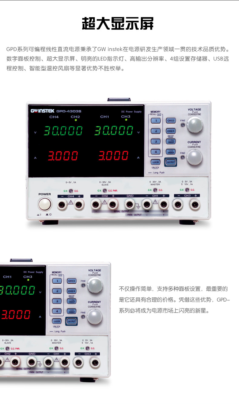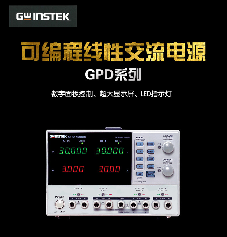 GPD-3303D可編程線性直流電源三組輸出,195W 輸出,0-30V/0-3A*2;(2.5V/3.3V/5.0V)/3A(固定),GPD-3303D可編程線性直流電源*小解析度: 100mV/10mA USB接口.