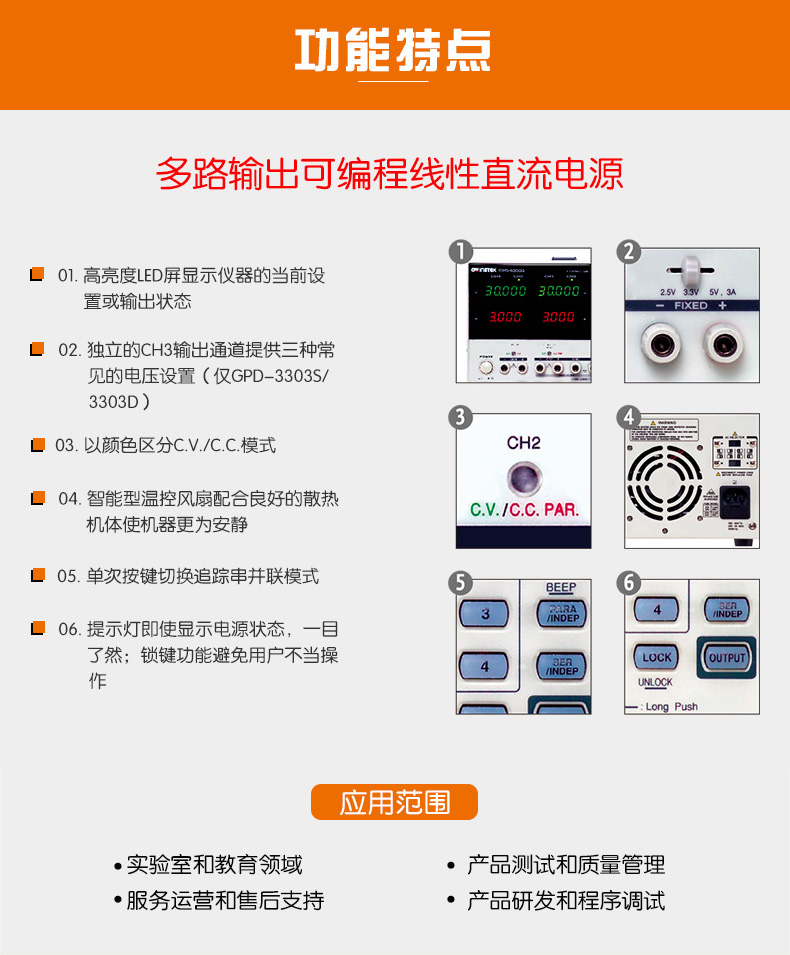 固緯gpd3303d直流穩壓電源秉承了GW Instek在電源研發生產領域一貫的技術品質優勢。數字面板控制、超大顯示屏、明亮的LED指示燈、高輸出分辨率、4組設置存儲器、USB遠程控制、智能型溫控風扇等顯著優勢不勝枚舉。不僅操作簡單,支持多種面板設置,*重要的是它還具有合理的價格。憑借這些優勢,GPD-系列必將成為電源市場上閃亮的新星。