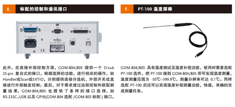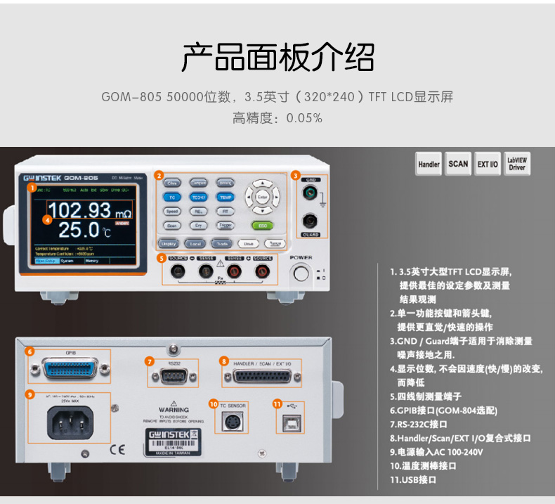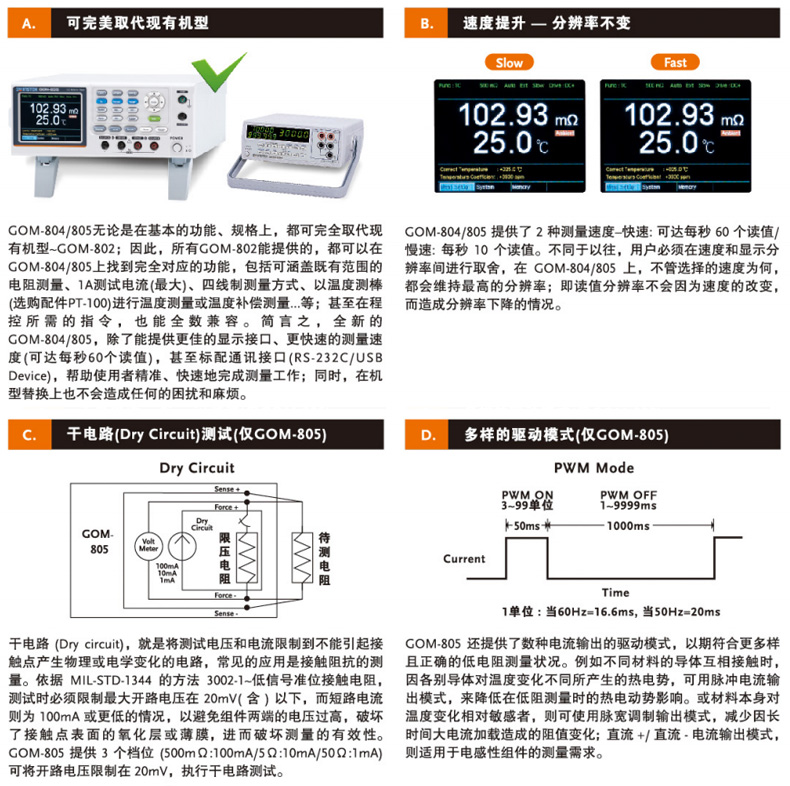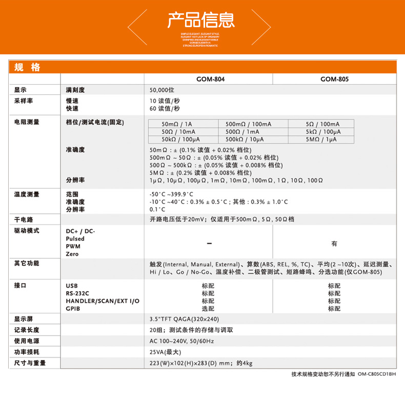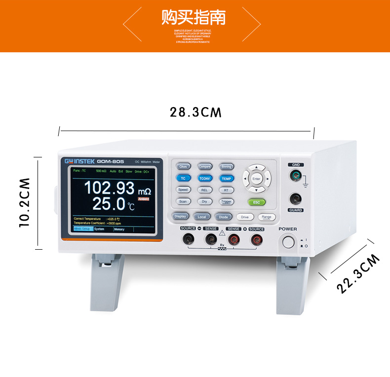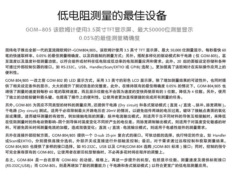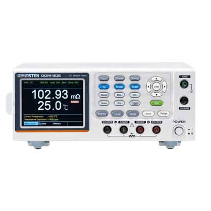 固緯微歐姆儀表gom805說明書該歐姆計使用3.5寸TFT顯示屏、* 大50000 counts量測顯示、每秒*快60筆的快速取樣率、0.05%的* 佳量測準確度、四線式的量測方式、溫度以及溫度補償量測功能,20組的面板設定記憶組;同時GOM-805還搭配多樣化的驅動模式和干電路,以符合組件或材料在低電壓或低功率的電阻量測之應用和需求。全系列搭配可透過外部控制儀器的接口,如RS-232C、USB、Handler / Scan / EXT IO或GPIB(選購),更加提高了該歐姆計在實際操作應用上的便利性。