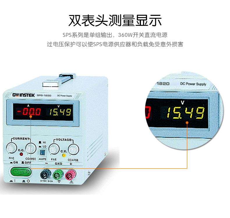 固緯sps2415可調直流開關電源是單組輸出,360W開關直流電源,過電壓保護可以使SPS電源供應器和負載免受意外損害。0.01%低變動率,過程監測端子可以補償電源和負載之間的線路損失,SPS系列電源是高利用率、高精度體積輕小的開關直流電源。