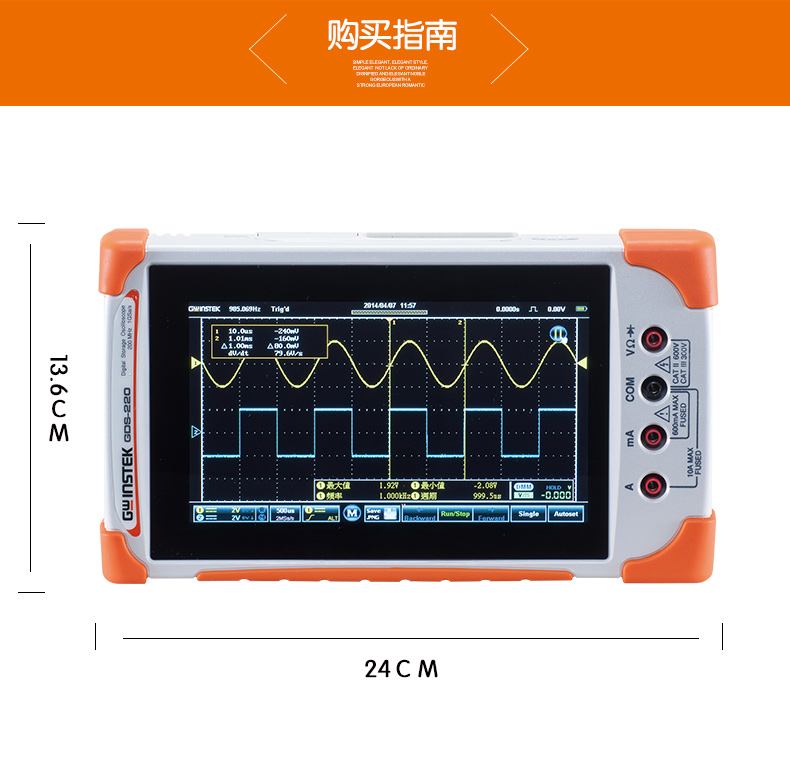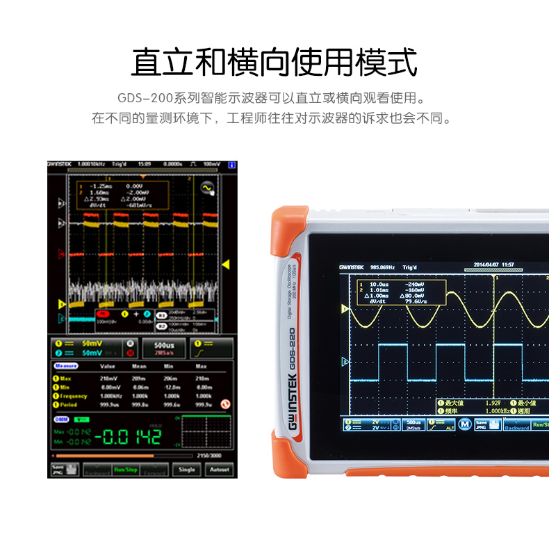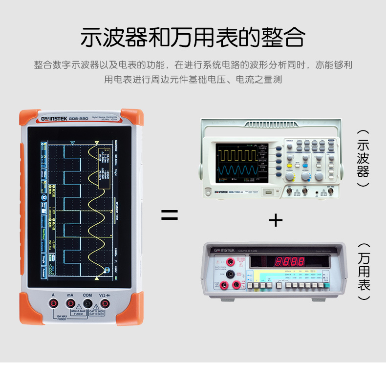 GDS-220:200MHz帶寬,雙輸入通道,1GSa/s*大實時采樣率,每通道*大1M記錄長度,7''(800×480)全觸摸電容性面板,LCD多點觸控,可直立/橫向顯示,內置5,000位數字萬用表,30,000連續波形記錄功能