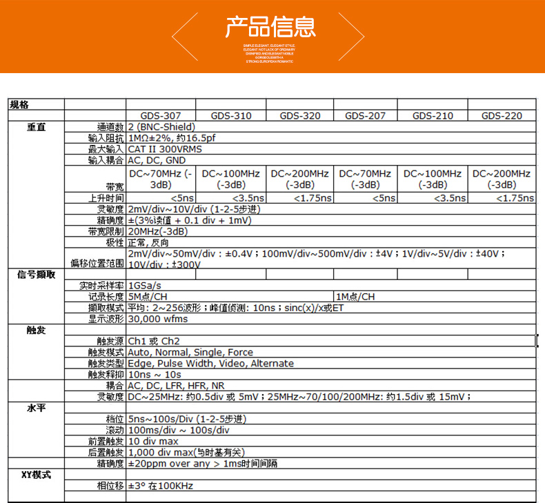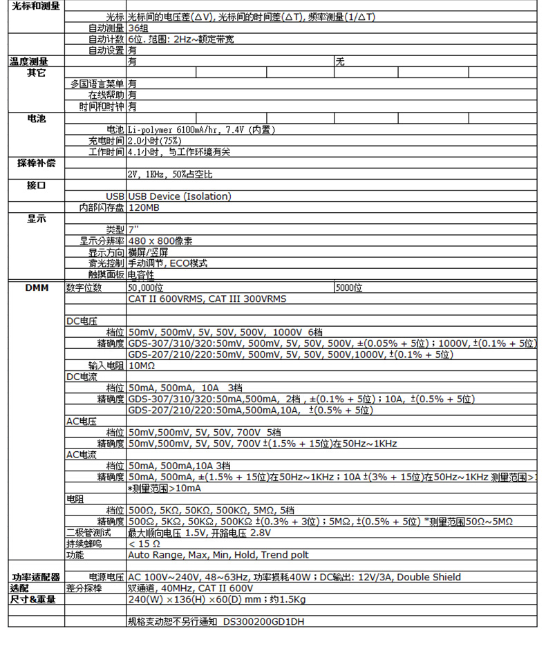 GDS-307:70MHz帶寬,雙輸入通道,1GSa/s* 大實時采樣率,每通道* 大5M記錄長度,7''(800×480)全觸摸電容性面板,LCD多點觸控,可直立/橫向顯示,內置50,000位數字萬用表,30,000連續波形記錄功能,隨時重放測量結果溫度測量和記錄功能.