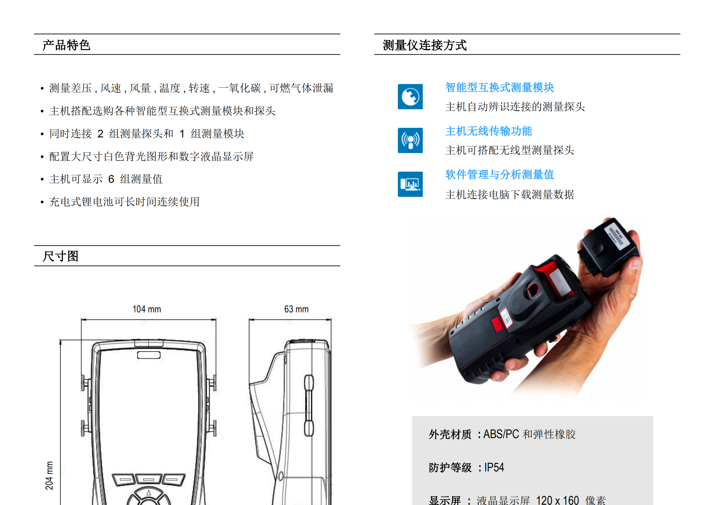 ? 搭配皮托管或翼型平均式測(cè)片可測(cè)量風(fēng)速和風(fēng)量, 風(fēng)速量程依差壓模塊型號(hào)不同而定 |