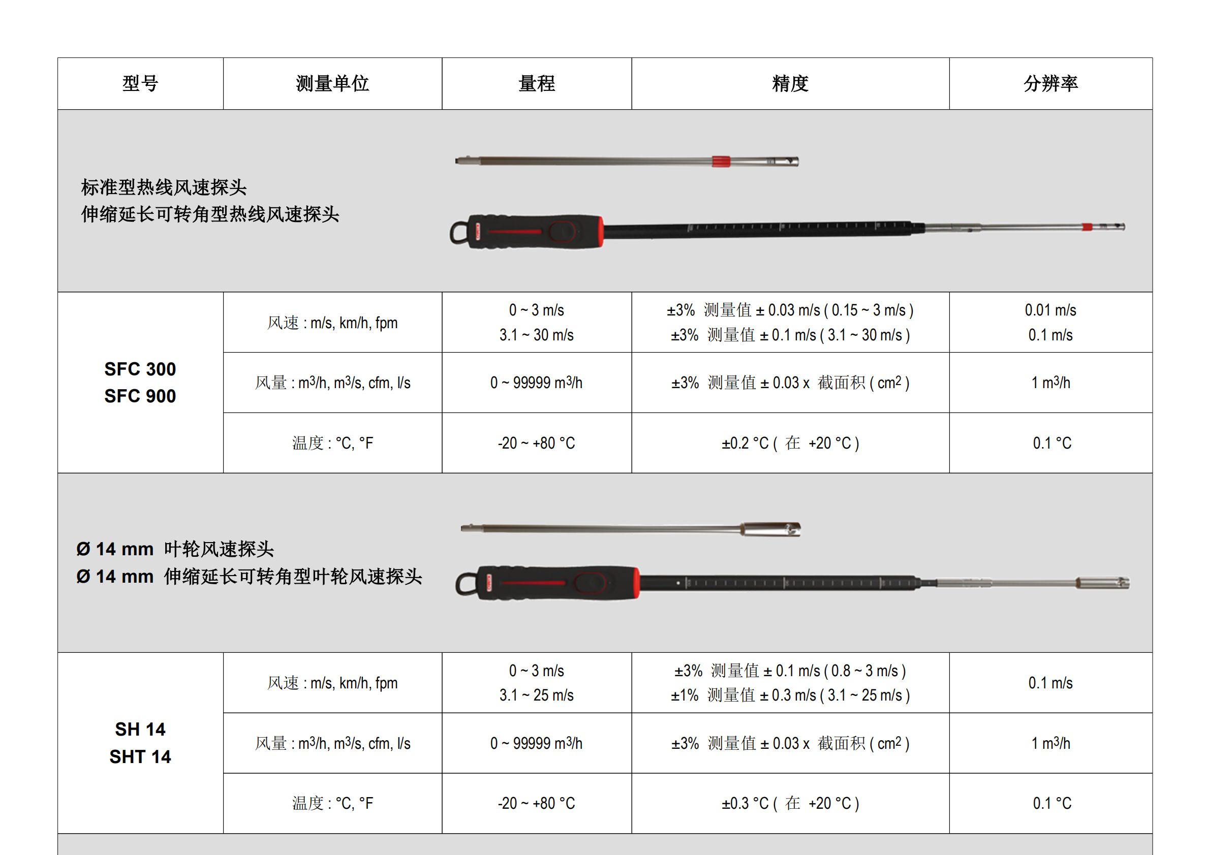 SFC 300 SFC 900 | 0 ~ 3 m/s | ±3% 測(cè)量值 ± 0.03 m/s ( 0.15 ~ 3 m/s ) | 0.01 m/s |