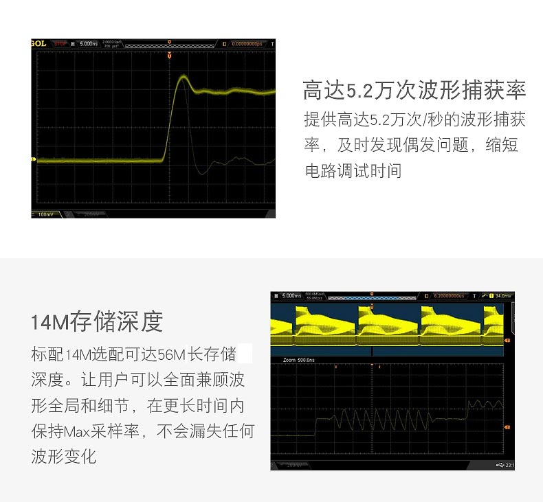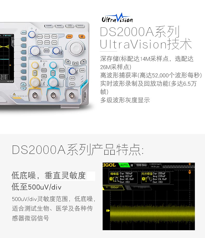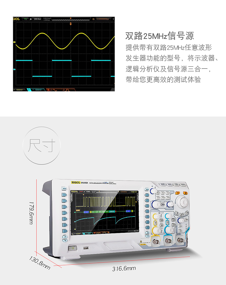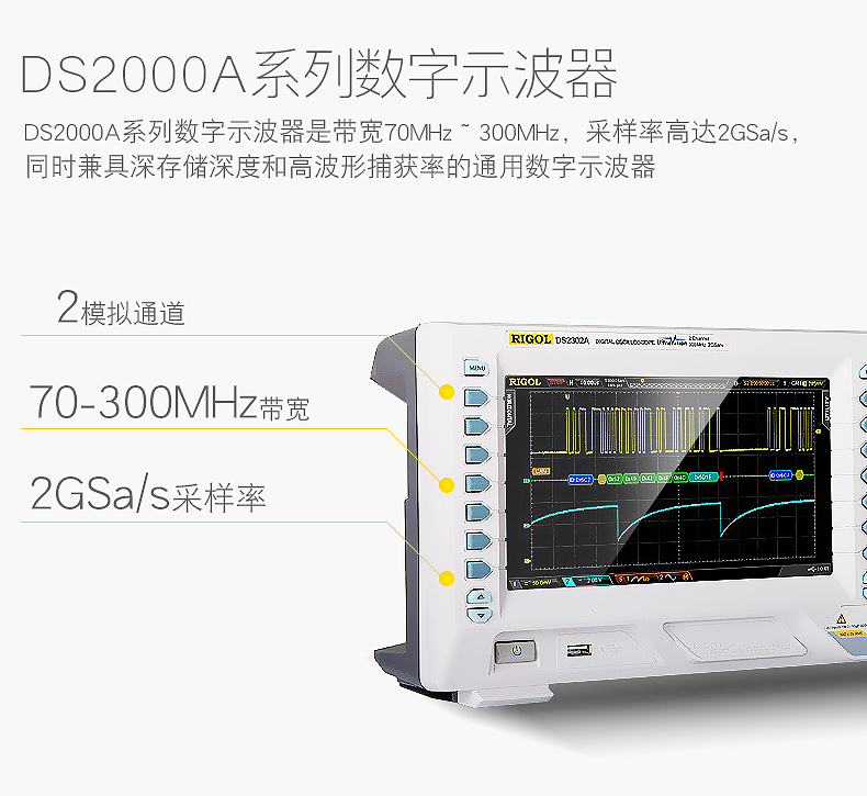 MSO/DS2000A系列示波器是帶寬70MHz ~ 300MHz,采樣率高達2GSa/s,同時兼具深存儲深度和高波形捕獲率的通用數字示波器。數字示波器MSO/DS2000A系列其中的MSO2000A系列產品具備2+16個通道,能夠為混合信號測試和嵌入式系統的調試分析提供強有力的幫助。