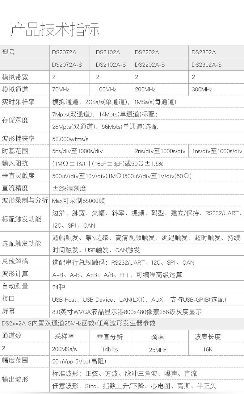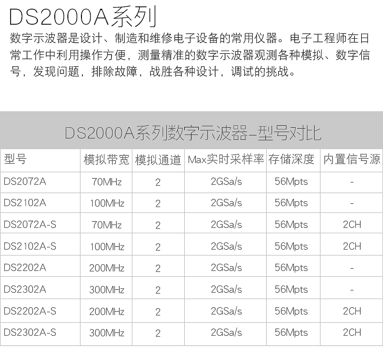 | DS2202A-S | 200MHz | 2 | 2GSa/s | 56Mpts | 52,000wfms/s | - | 2CH |