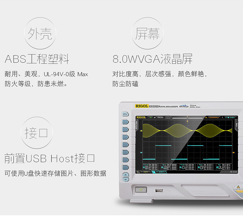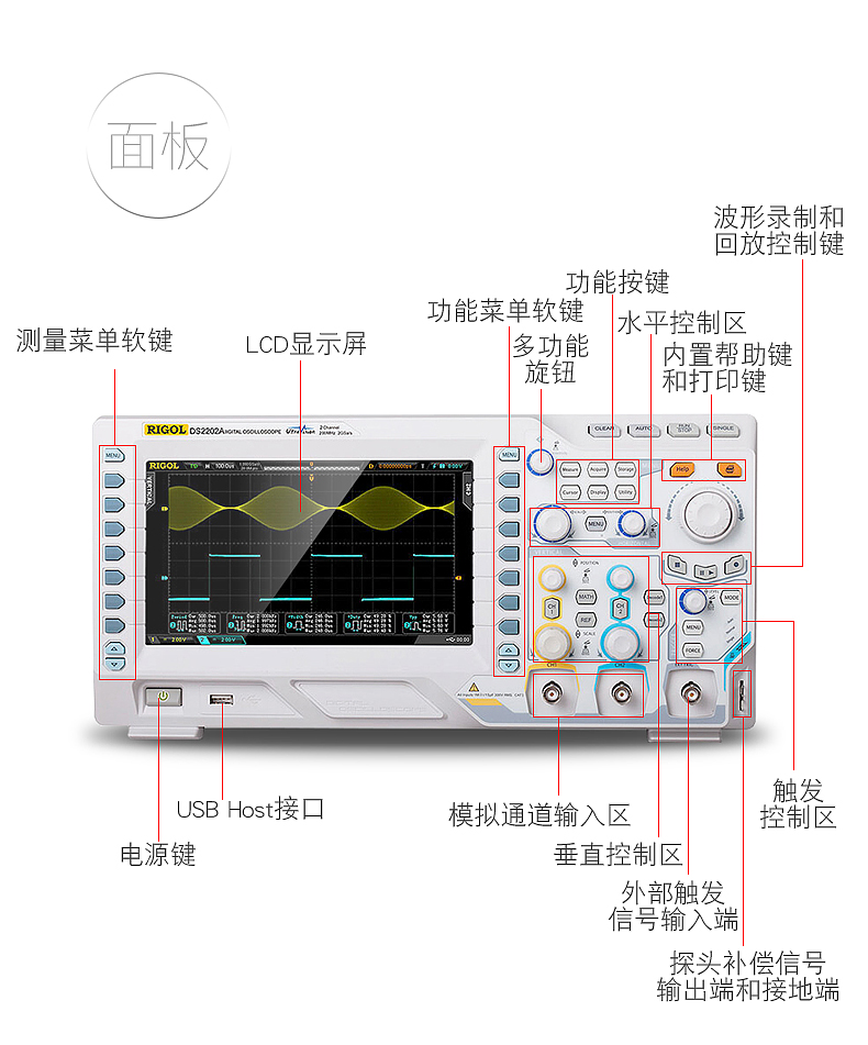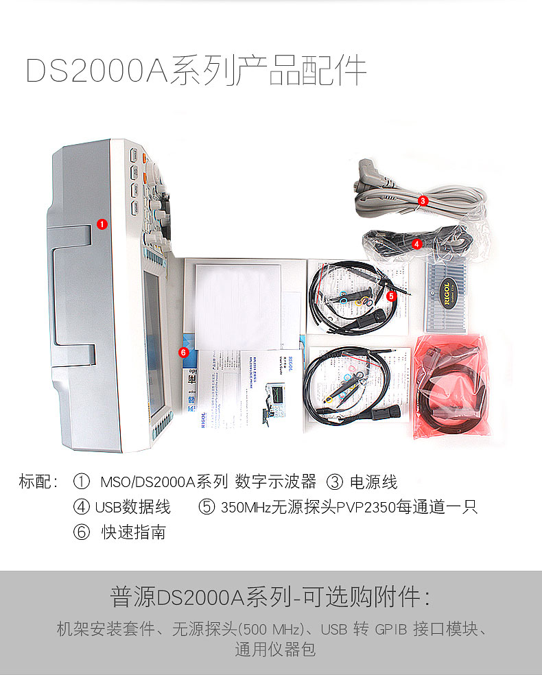 標準配件 : 350MHz無源探頭PVP2350每通道一只;邏輯探頭RPL2316一套(限MSO型號);USB數據線;電源線;快速指南