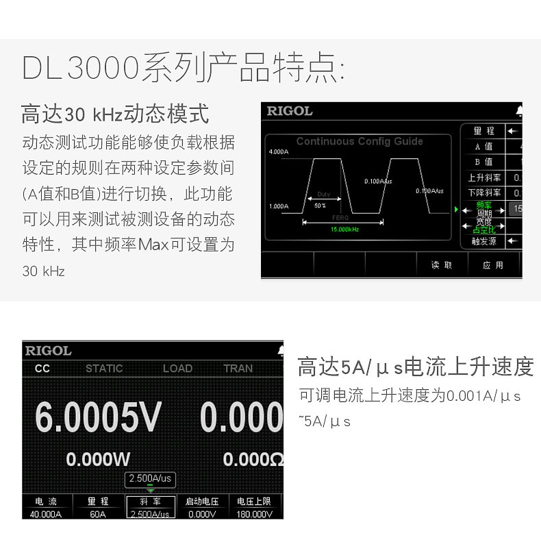 動態測試功能能夠使負載根據設定的規則在兩種設定參數間(A值和B值)進行切換,此功能可以用來測試被測設備的動態特性,其中頻率Z 高可設置為30 kHz。