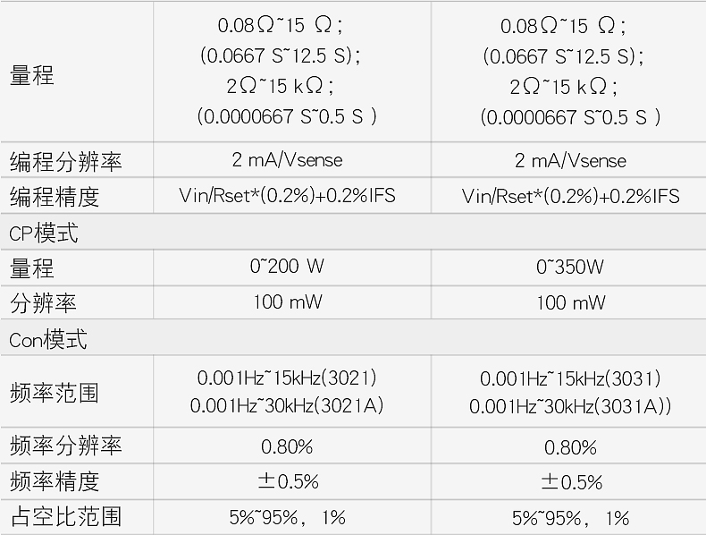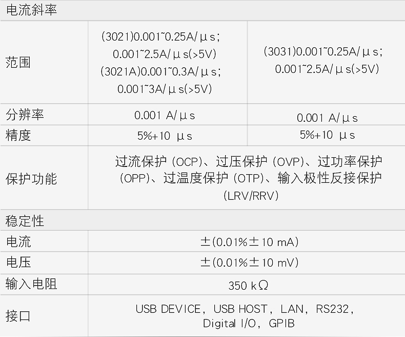 系列 | 總功率 | 電壓 | 電流 | Z 高頻率 | 電流斜率 | 電流回讀分辨率 |