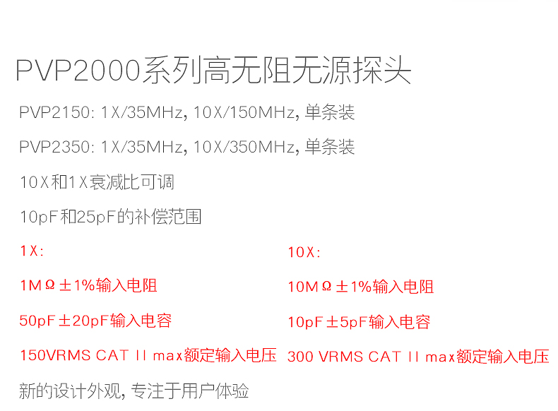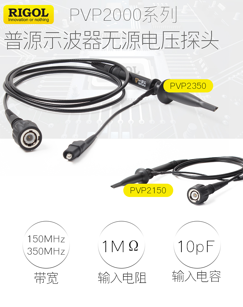 普源PVP2000系列包含兩個型號:PVP2150和PVP2350,10X帶寬為150MHz和350MHz,分別用于替代RP2200和RP3300A。同時,該系列探頭將1X帶寬從7MHz提高到35MHz,這是探頭性能的一項重要提升,為廣大電子工程師低電平信號的測量提供了理想的選擇。用于替代原有的RP2200和RP3300A,成為RIGOL示波器DS1000E/D/U、DS1000B、MSO/DS1000Z\MSO/DS2000A、DS4000E系列的標配探頭