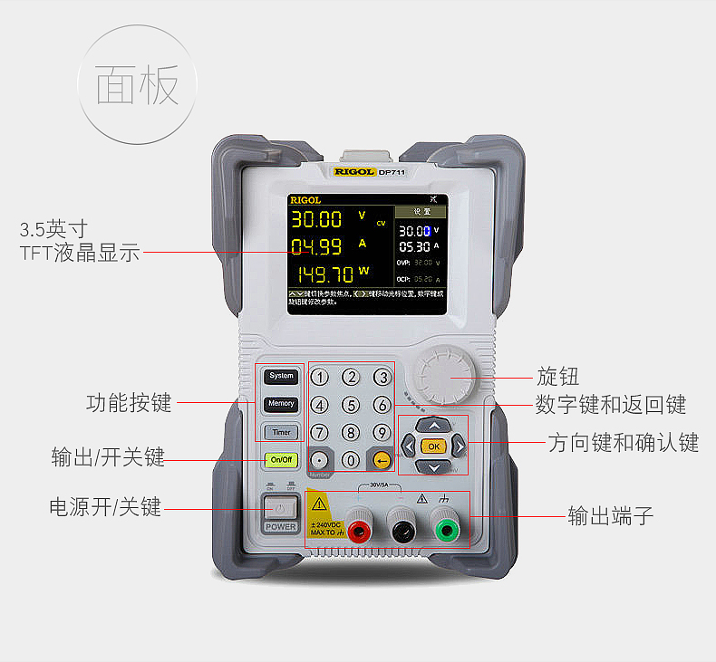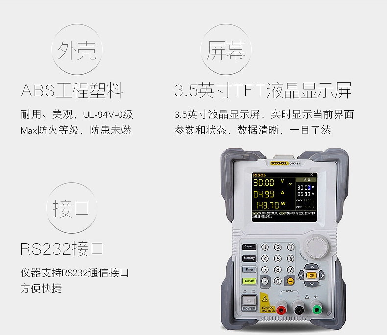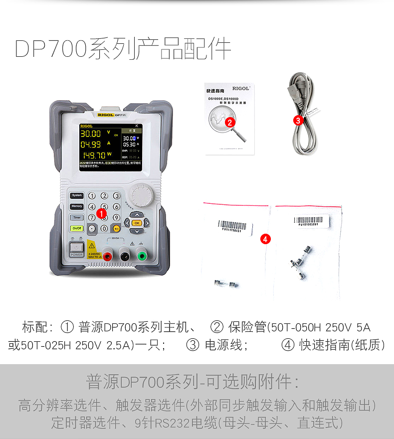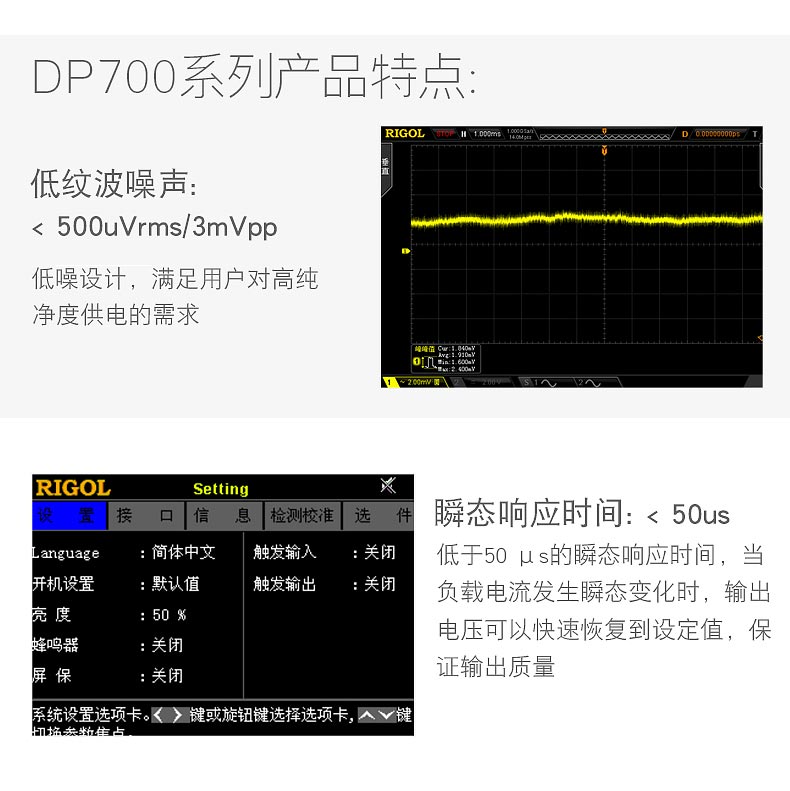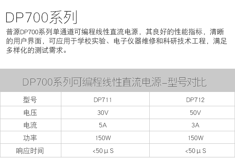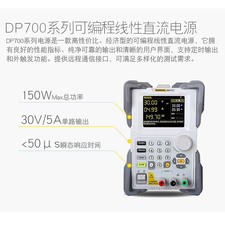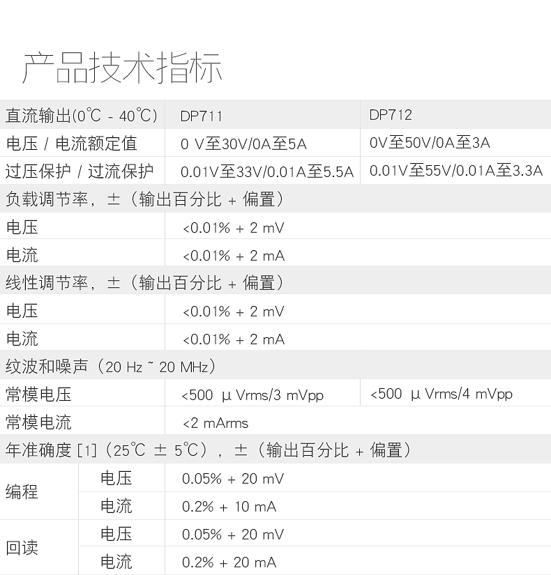 普源可編程直流穩壓穩流電源DP711為30V/5A單通道可編程線性直流電源,是為需求成本更低、尺寸更小的高可靠性電源用戶設計的一款基礎電源產品,具有低紋波噪聲,快速瞬態響應,優秀的電源和負載調節率等特性,并具備強大的定時輸出功能以及完備的保護功能。