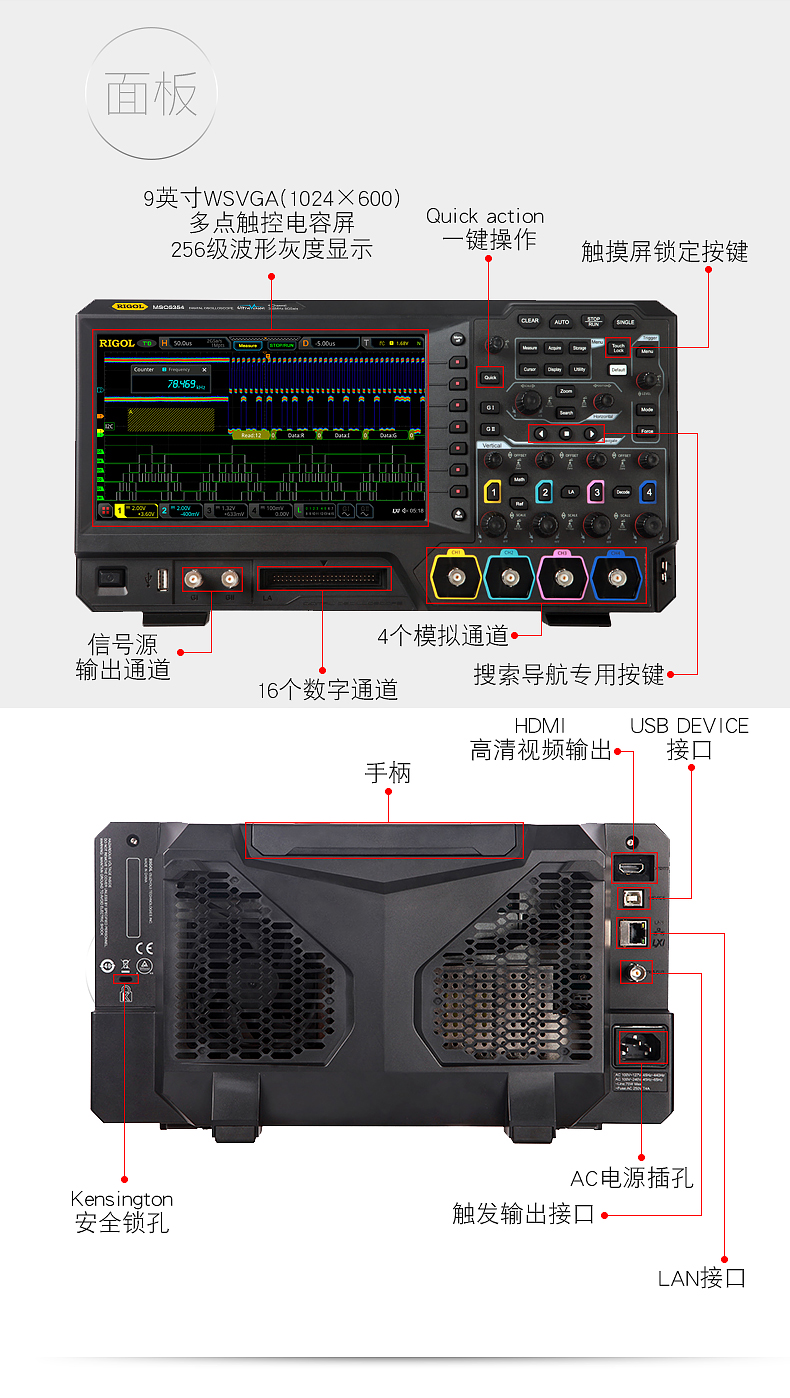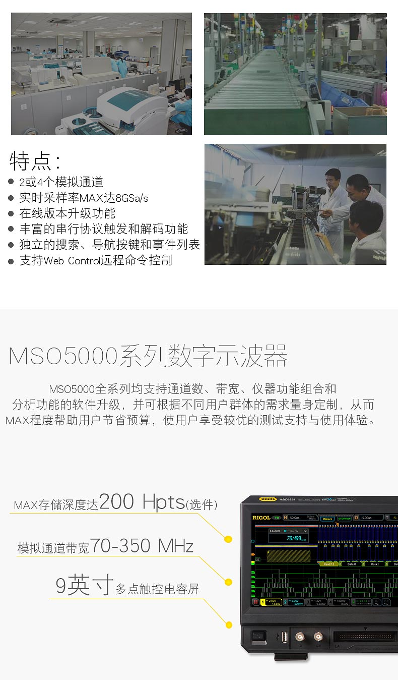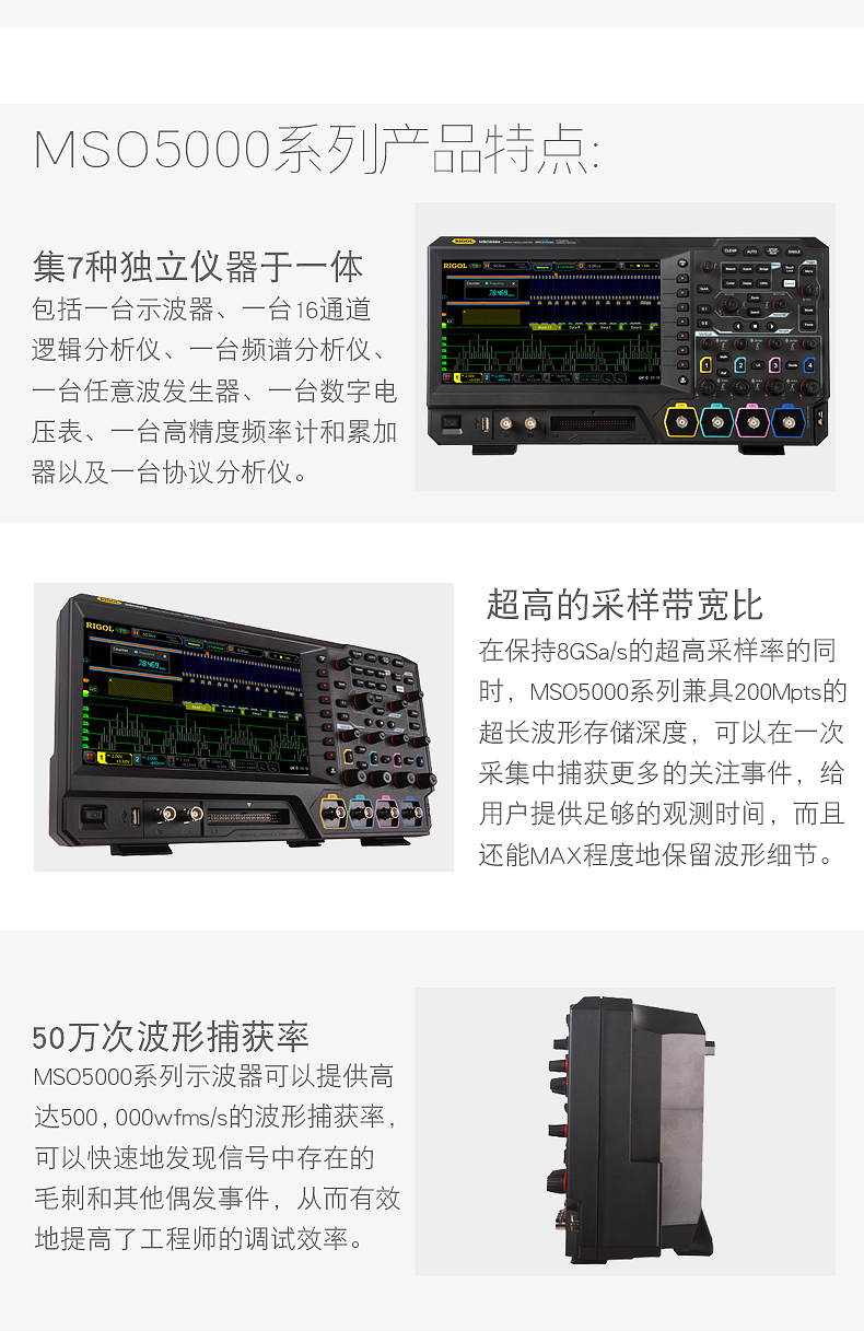 普源MSO5000系列數字示波器是基于RIGOL UltraVision II代技術的高性能中低端數字示波器,采用9英寸多點電容觸摸屏,集7種儀器于一身。具有較高的采樣帶寬比和存儲深度等優異的性能指標,以及精巧便攜的外觀設計。高集成度的ASIC芯片組和創新性的前端無繼電器設計,有效地延長了示波器的使用壽命,降低使用成本。同時,全系列均支持通道數、帶寬、儀器功能組合和分析功能的軟件升級,可根據不同用戶群體的需求量身定制,從而幫助用戶節省預算,使用戶享受**地測試支持與使用體驗。