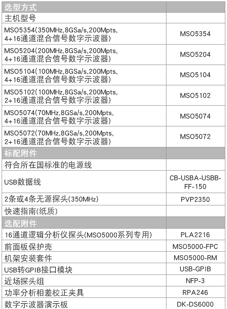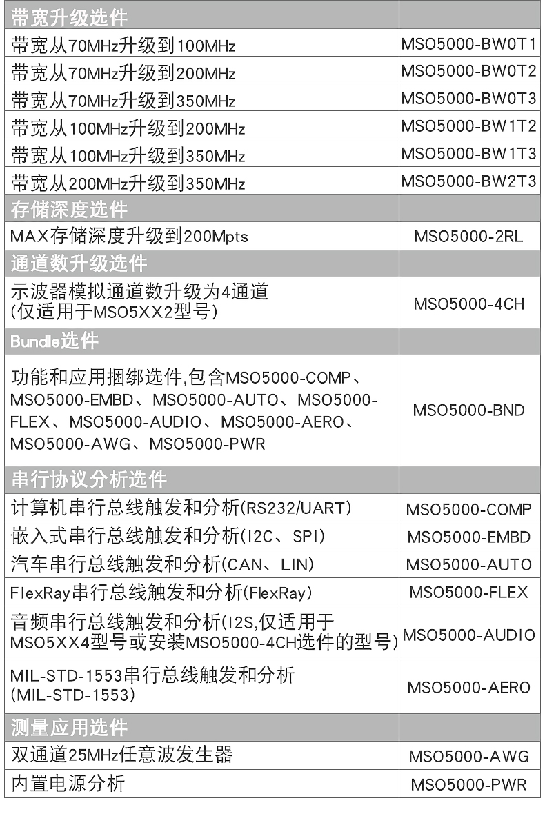 普源MSO5000系列數字示波器帶寬包含70MHz,100MHz,200MHz和350MHz。具有2通道和4通道型號,集數字示波器、邏輯分析儀、頻譜分析儀、任意波發生器、數字電壓表、頻率計和累加器、協議分析儀七種儀器功能于一體。支持通道數、帶寬、任意波形發生器和協議分析功能升級,任意型號均可通過購買一條PLA2216邏輯探頭實現16通道邏輯分析儀功能。