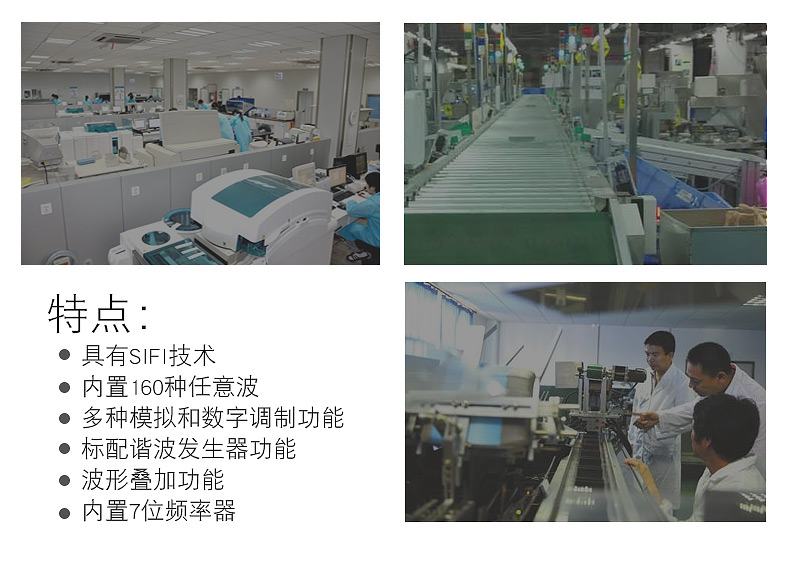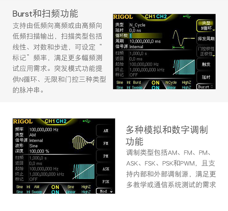 豐富的調制功能:AM、FM、PM、FSK,以及輸出線性/對數(shù)掃描和脈沖串波形