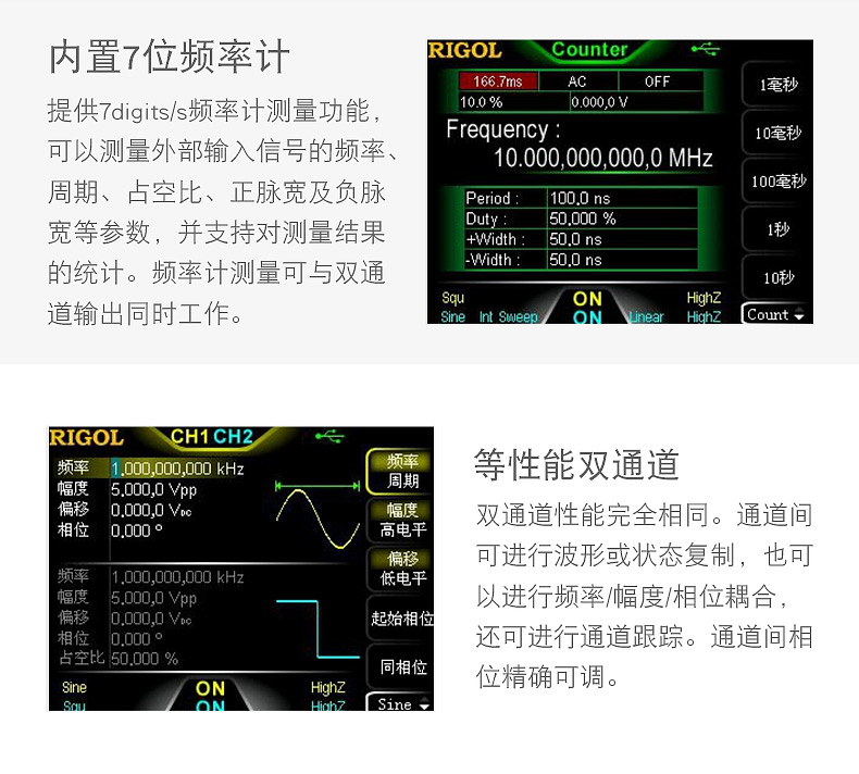 內置高精度、寬頻帶頻率計,可測量范圍:100 mHz ~ 200 MHz(單通道)