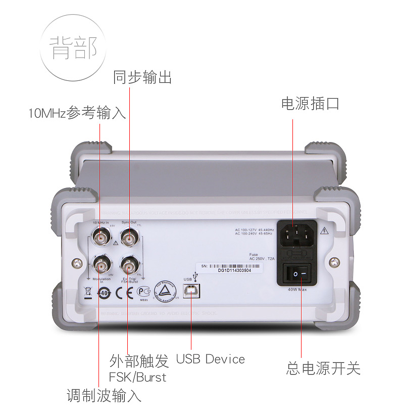 豐富輸入輸出:波形輸出,同步信號輸出,外接調制源,外接基準10 MHz時鐘源,外觸發(fā)輸入
