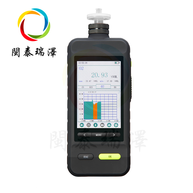 -顯示內容:氣體名稱或氣體化學分子式、濃度數據、計量單位、氣體曲線走向、電池電量、時間、泵狀態等。選配:溫度、濕度、壓力、藍牙狀態、打印機狀態、截屏狀態等。