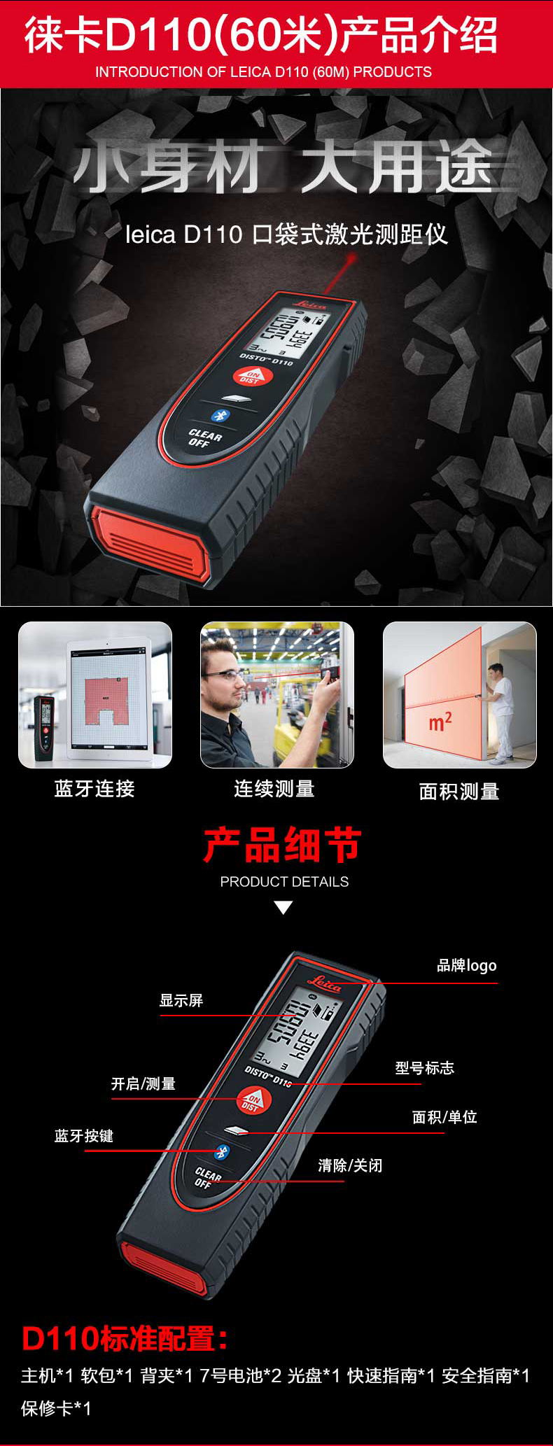 Leica DISTO D110是全球D1款具有智能藍牙的口袋式激光測距儀。身型苗條的它手持舒適,優良愛不釋手。使用可拆卸口袋夾,