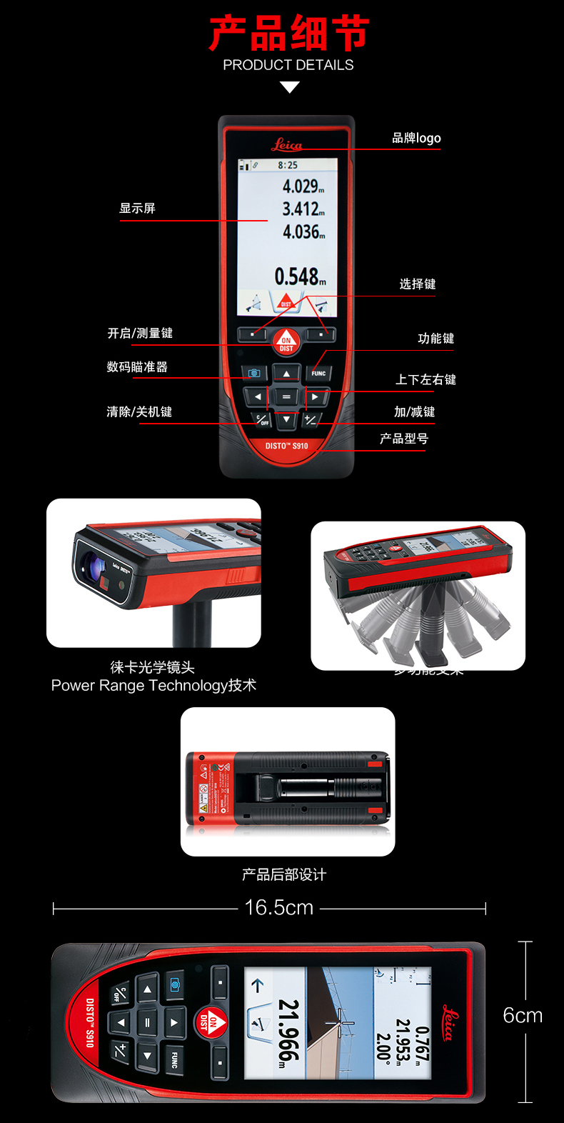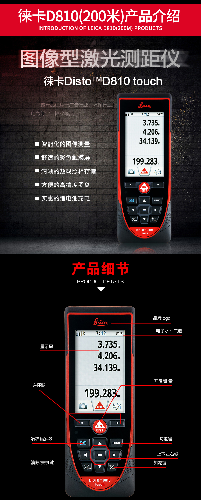 D810 Touch激光測距儀,高精度激光測距測高儀測量范圍 : 0.05 m ~ 200 m ; 測量精度 ( 典型 ) : ± 1.0 mm / ± 0.04 in ,距離,面積,體積,角度,間接測高,變焦數碼瞄準器,無線藍牙傳輸,高度輪廓測量 ,D810 Touch激光測距儀彩屏數字圖像顯示!高精度