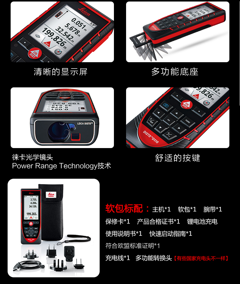 徠卡D810 touch 是世界上一款帶圖像測量的手持激光測距儀。它在不靠近目標的情況下,調節D810 touch屏幕上的圖像光標就可以進行遠程測量。圖像測量可以直接測量目標的,長度、寬度、面積、直徑、周長等。徠卡D810 touch具有高精度羅盤、舒適的彩色觸摸屏、四倍數碼瞄準器、清晰的數碼照相功能、鋰電池充電、新一代藍牙4.0、徠卡Sketch軟件等諸多優勢。這些功能讓測距儀不再是個工具而是儀器。