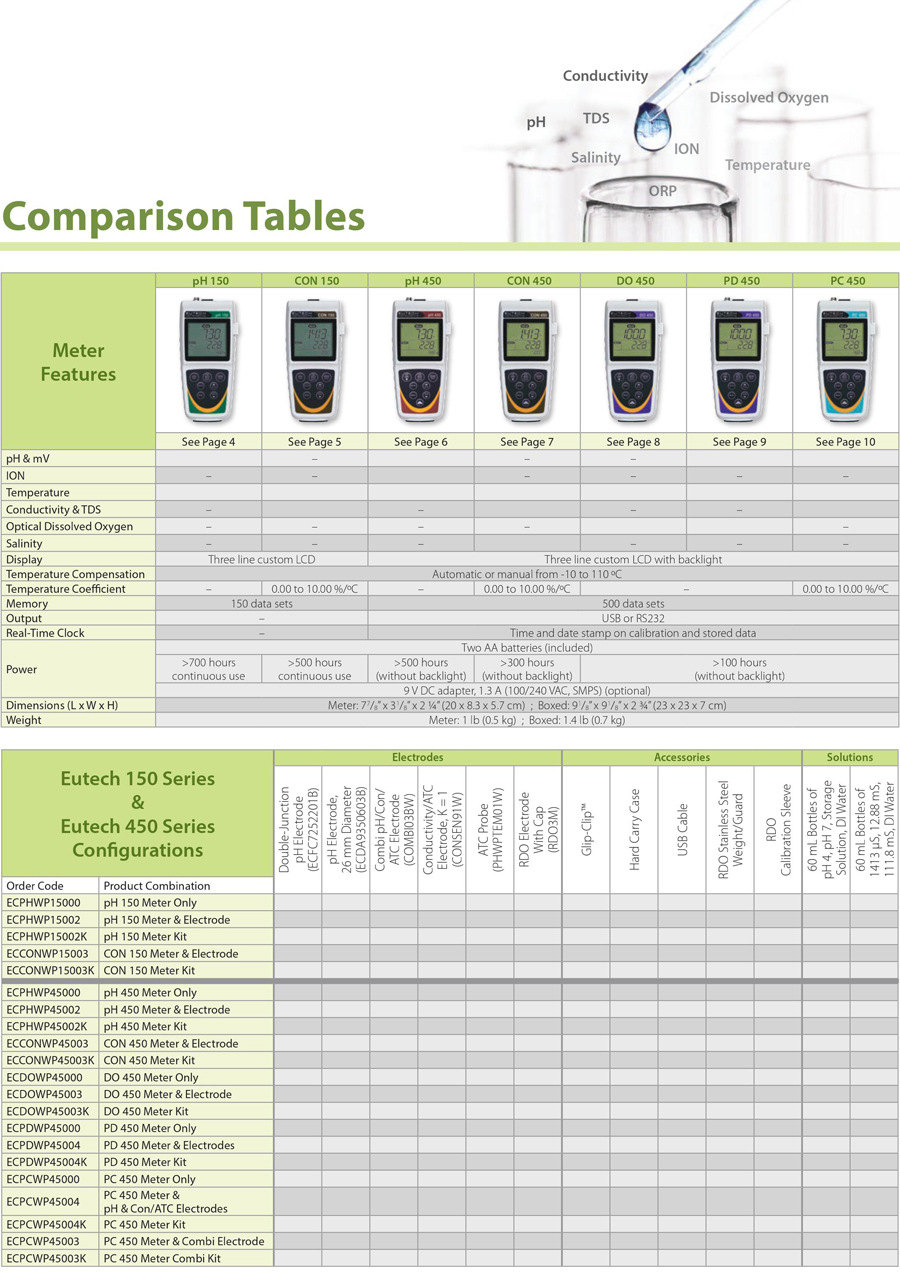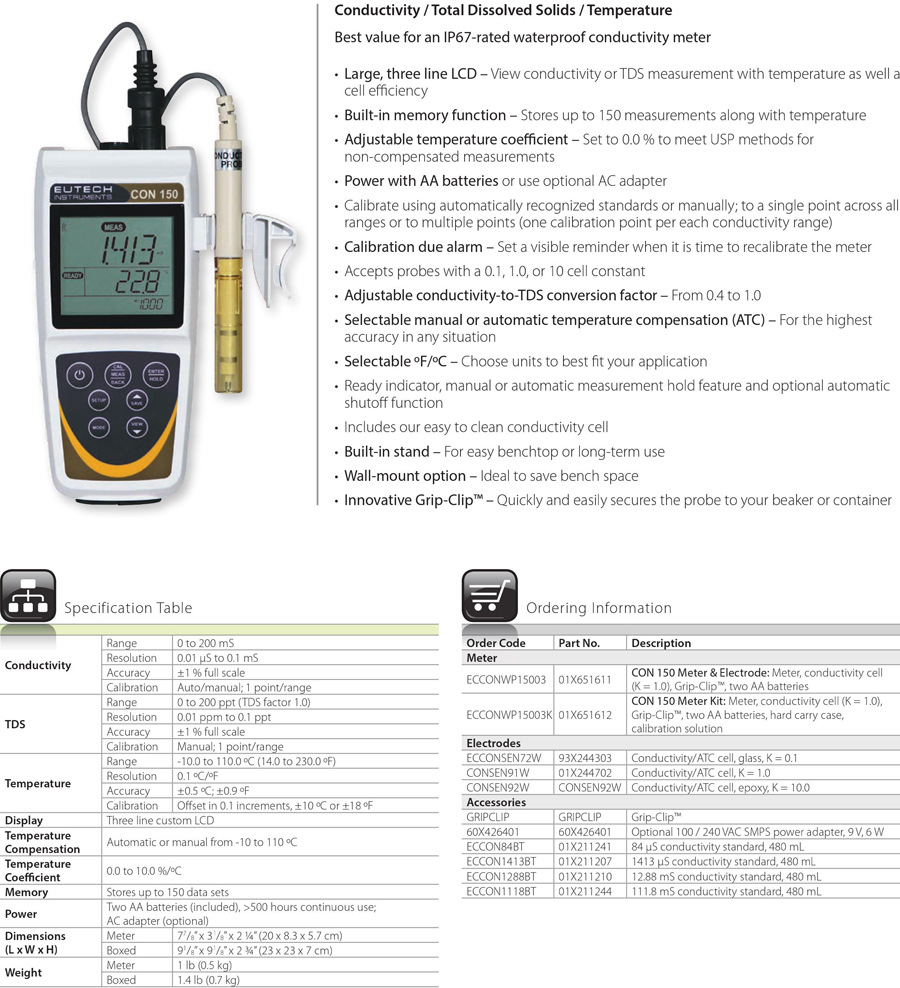 美國Eutech優特Con150便攜式電導率儀套裝ECCONWP15003K訂貨指南