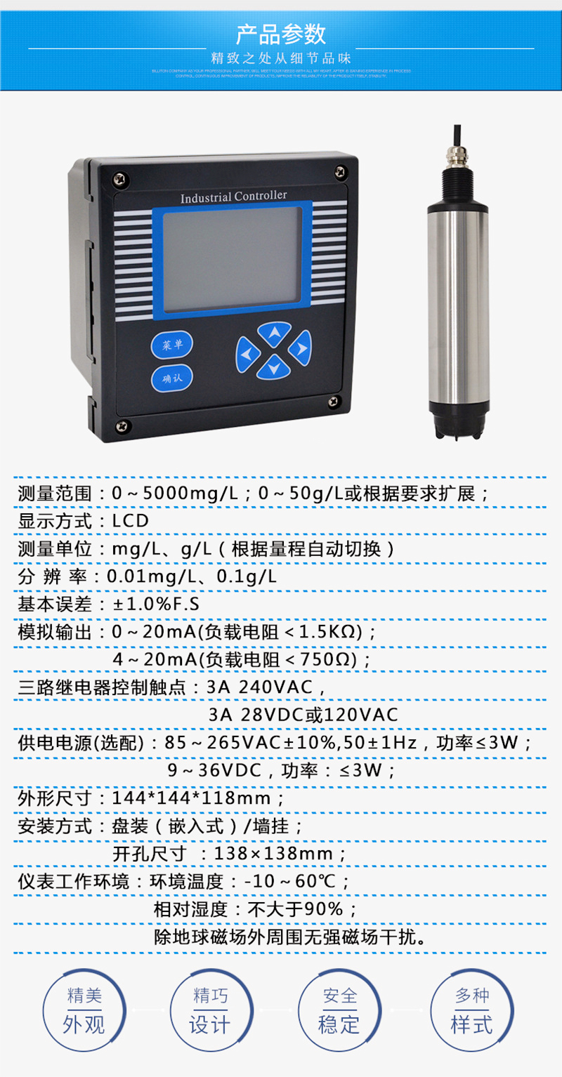 (3)分辨率:濃度:0.01mg/L;0.1g/L;溫度:0.1℃;