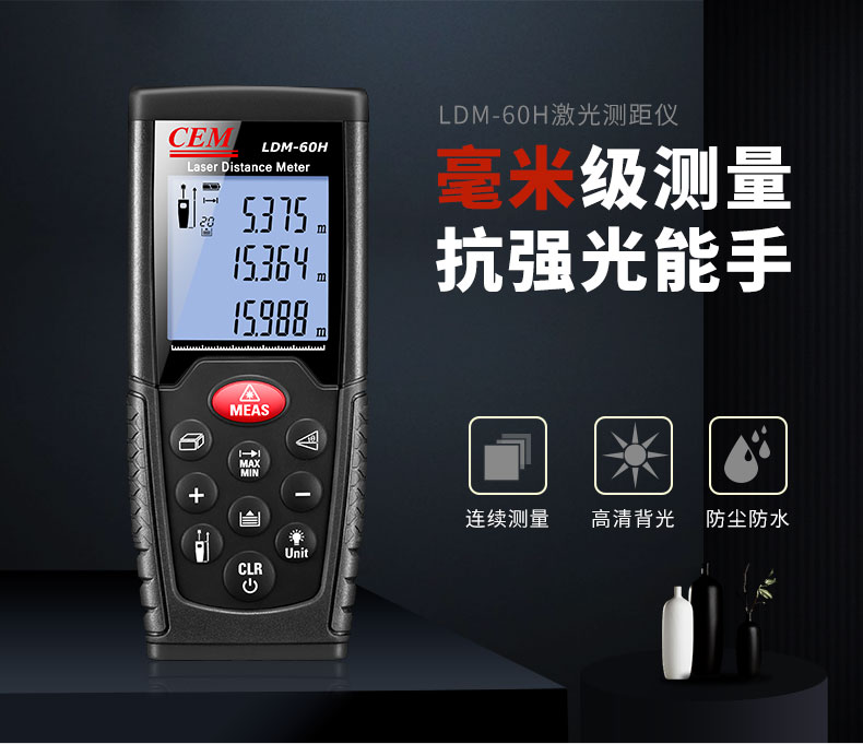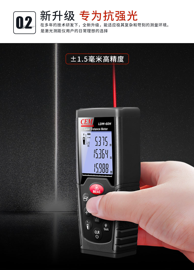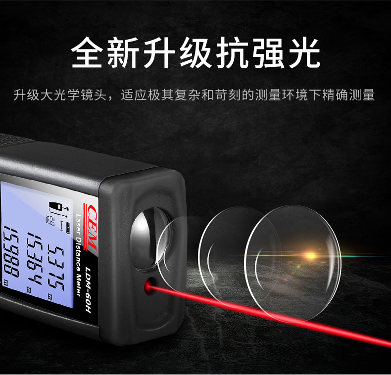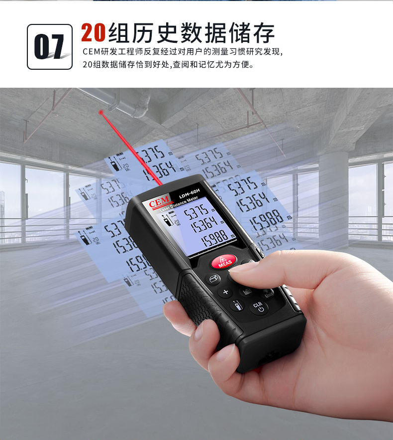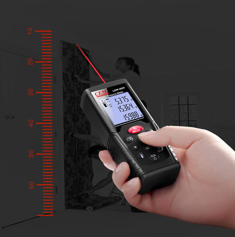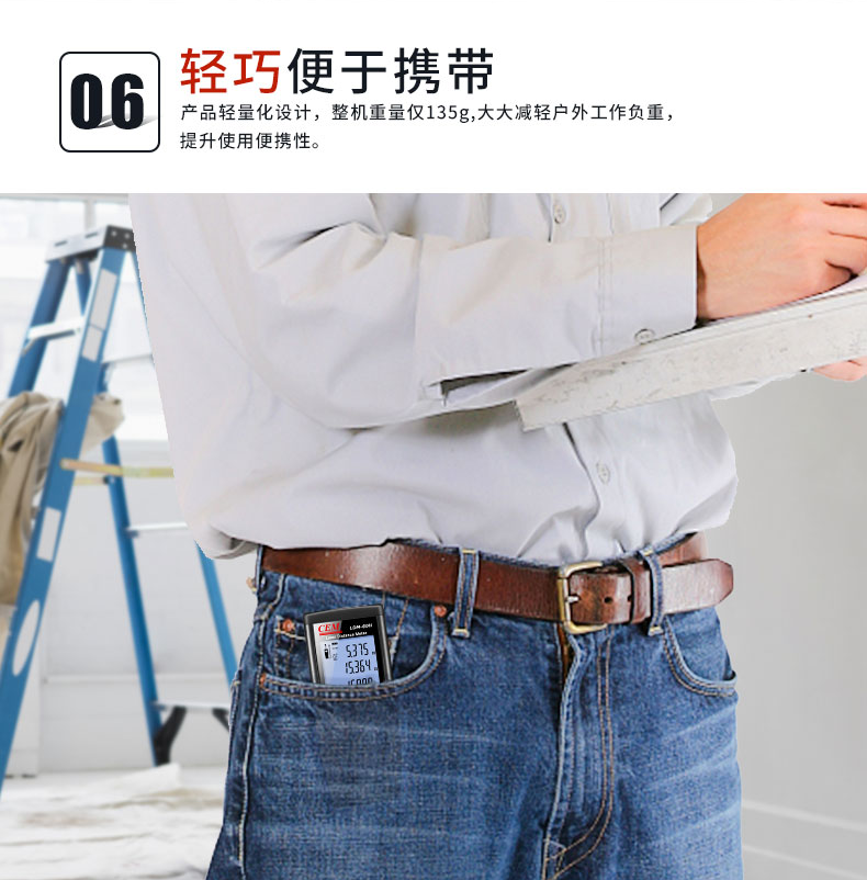 CEM自行設計、研發和制造的LDM-100手持式激光測距儀系列,使用簡單安全,僅需單人操作并無需借助其他工具,即使在非常苛刻的測量環境中也可輕松應對。精巧便攜的外觀設計便于室內和戶外使用,加、減、勾股定理、面積和體積計算的快捷鍵使得測量迅速而可靠,至少可存儲20組數據。此系列產品僅是CEM在激光測距領域的技術創新和變革開始,后續CEM將為用戶提供更新、更及時的產品和服務。