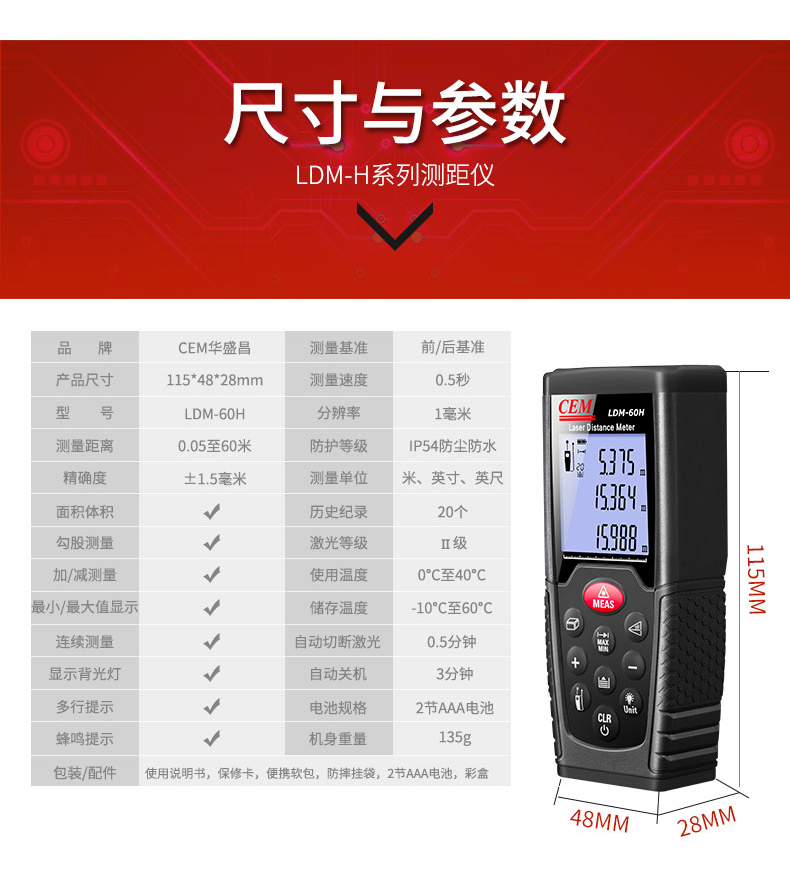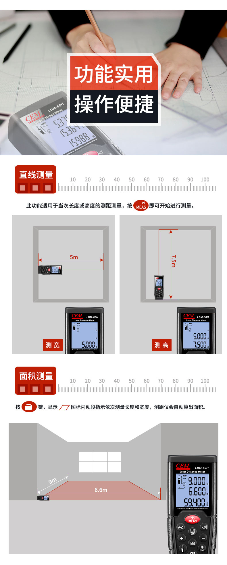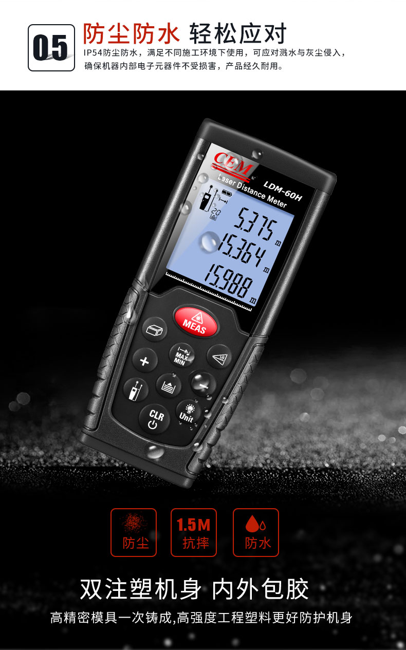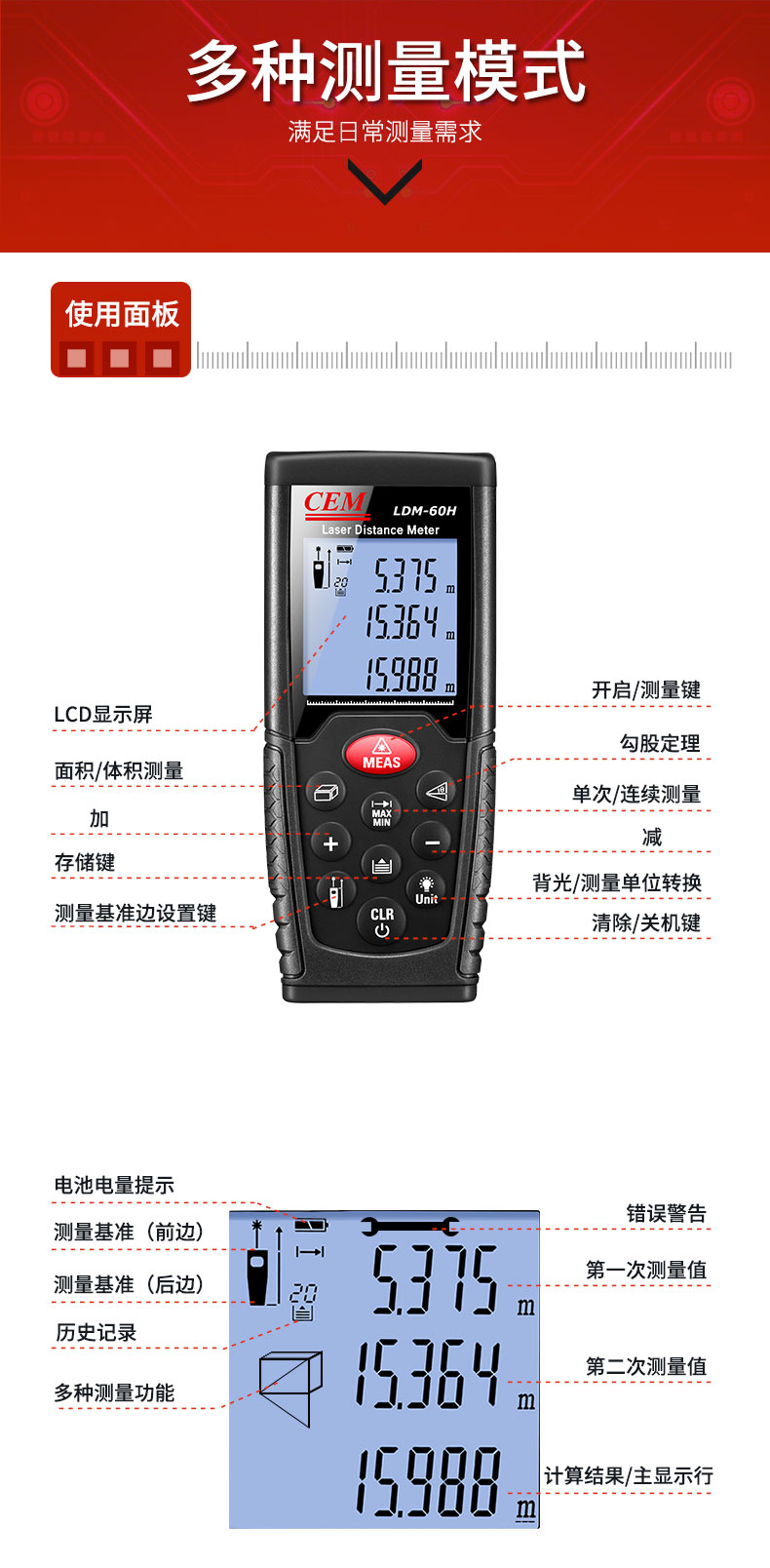 CEM自行設計、研發和制造的LDM-100手持式激光測距儀系列,使用簡單安全,僅需單人操作并無需借助其他工具,即使在非常苛刻的測量環境中也可輕松應對。精巧便攜的外觀設計便于室內和戶外使用,加、減、勾股定理、面積和體積計算的快捷鍵使得測量迅速而可靠,至少可存儲20組數據。此系列產品僅是CEM在激光測距領域的技術創新和變革開始,后續CEM將為用戶提供更新、更及時的產品和服務。